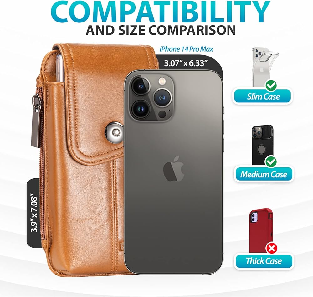 • التوافق والحجم: مقاس 7.08 × 3.9 × 0.78 بوصة، يناسب الهواتف الذكية الكبيرة بأحجام تصل إلى 6.7 بوصة مع حافظة رفيعة أو متوسطة. متوافق مع iPhone 15 Pro Max وiPhone 15 Plus وiPhone 14 Pro Max وiPhone 14 Plus وiPhone 13 Pro Max , iPhone 12 Pro Max, iPhone 11 Pro Max, iPhone XS Max, iPhone 8 Plus, iPhone 7 Plus, iPhone 6s Plus, iPhone 6 Plus, Samsung Galaxy S24 Ultra, S23 Ultra, Galaxy S22 Ultra 5G, Galaxy S22+ 5G, Galaxy Note 20 Ultra وGalaxy S21 Ultra 5G وطرز الهواتف الأخرى ذات الحجم نفسه.