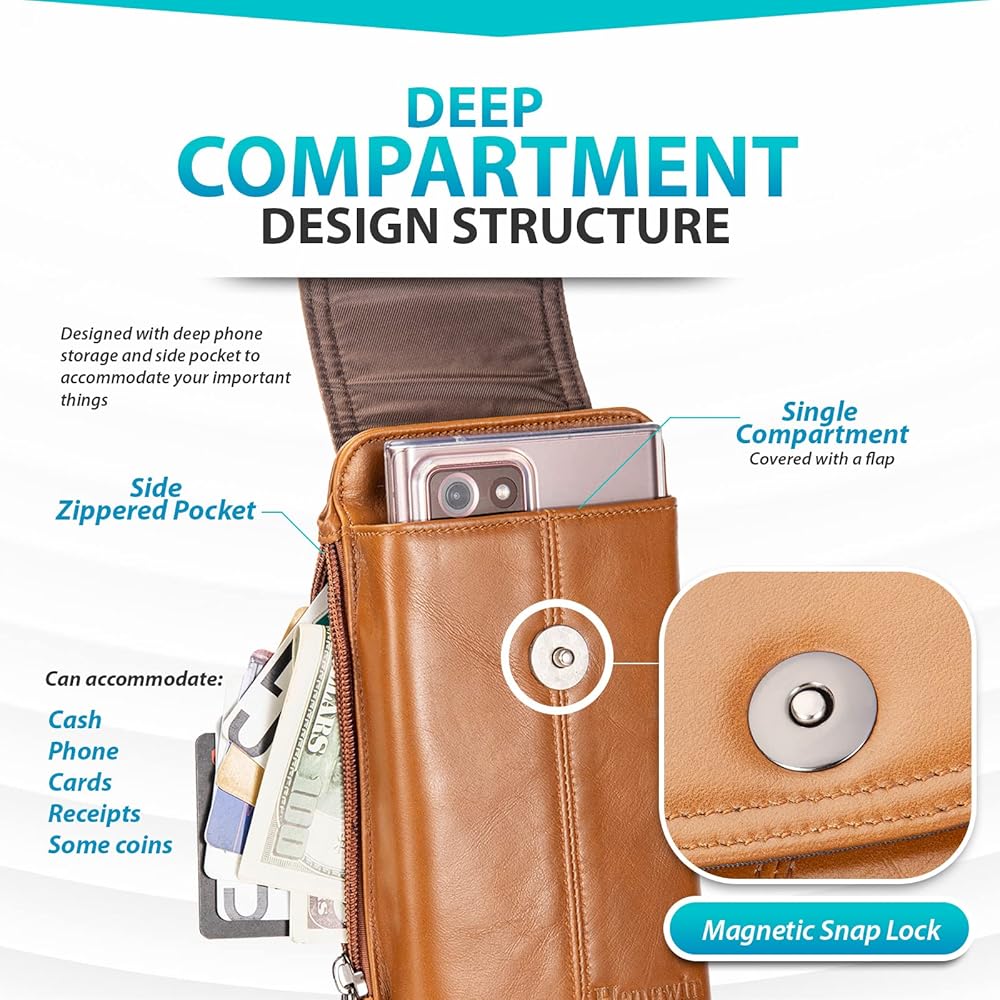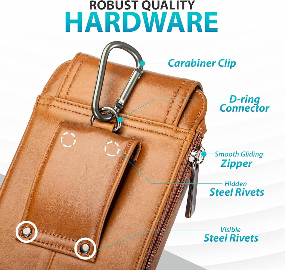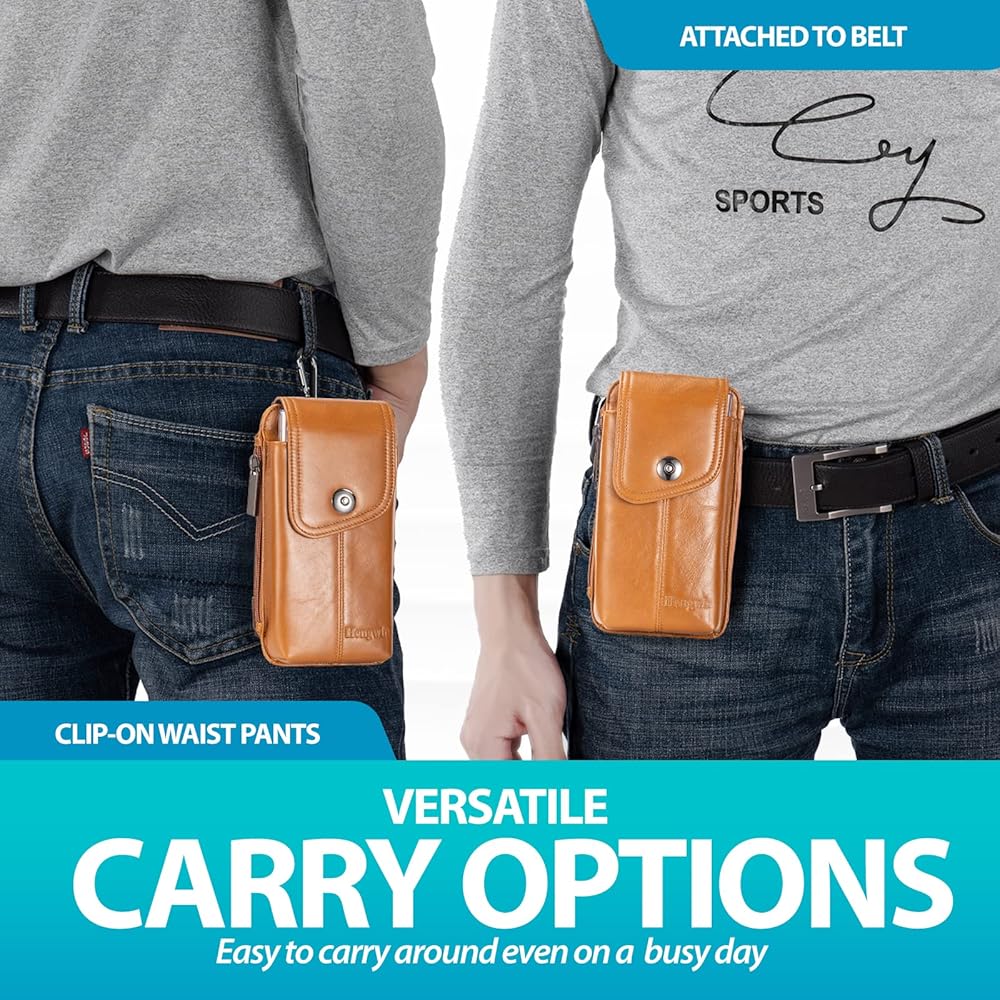 • خيارات للحمل: تحتوي حقيبة الهاتف الجلدية على حلقة حزام بعرض 2.5 بوصة يمكن أن تستوعب أي حزام عادي الحجم، صغير الحجم وسهل الوصول إليه على الخصر. يحتوي على مشبك حزام لربطه بحقيبة الظهر وحلقة البنطلون وميزات أخرى.