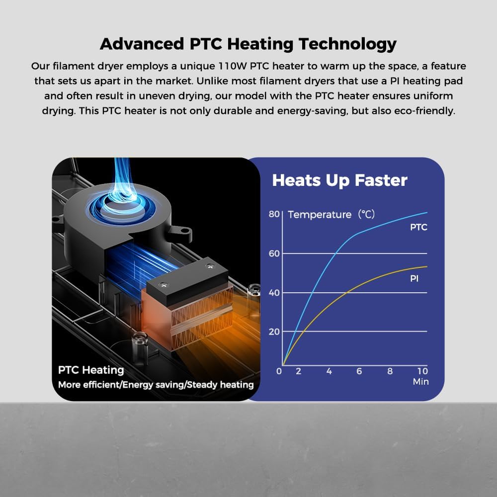 [تسخين الهواء الساخن المزدوج PTC 360'] يسخن المجفف بسرعة باستخدام مروحة مدمجة، ويدور الهواء الساخن 360 بوصة من أجل تسخين موحد، وتجفيف خيوط الرطوبة بشكل فعال وتحسين نتائج الطباعة.