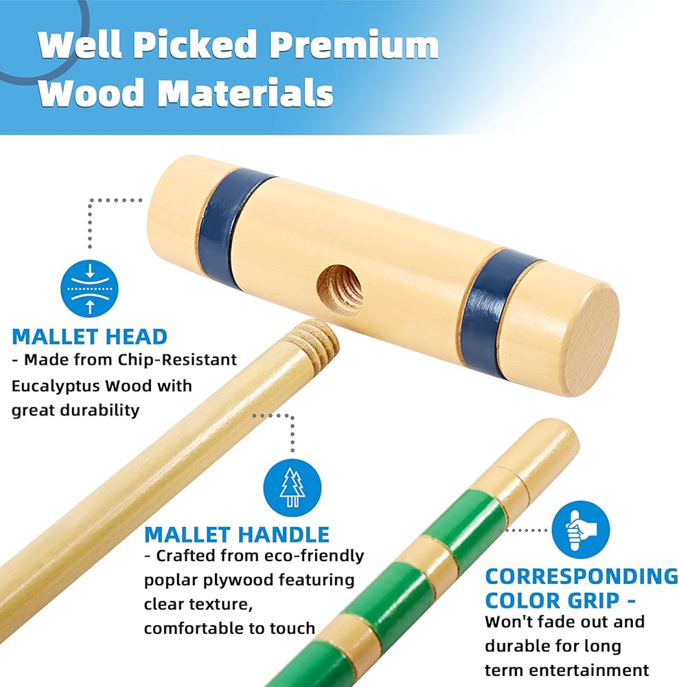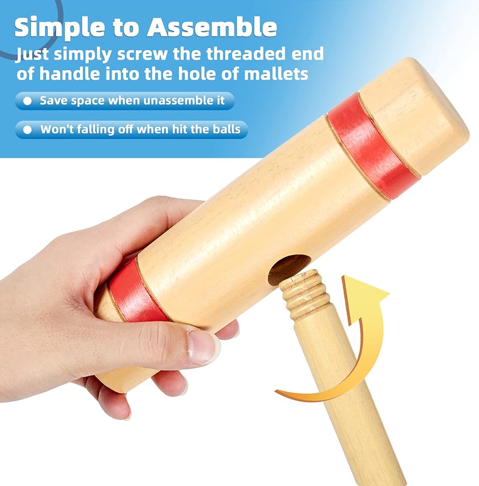 مواد فاخرة تدوم طويلاً: مصنوعة من خشب الصنوبر والأوكالبتوس الصديق للبيئة، وقد صُممت مطارقنا لتدوم طويلاً. الكرات مصنوعة من بوليمر مرن عالي الجودة، مما يضمن أنها لن تتشقق.