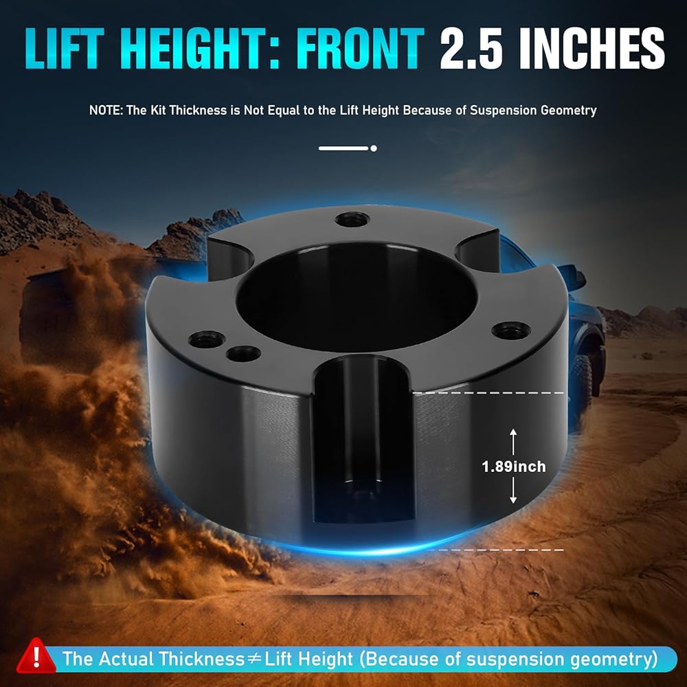 • 【Note】:Will raise your vehicle 2.5 inch in the Front. Due to suspension geometry, the ratio between lift height and kit thickness is not 1:1, An alignment is always recommended after installing