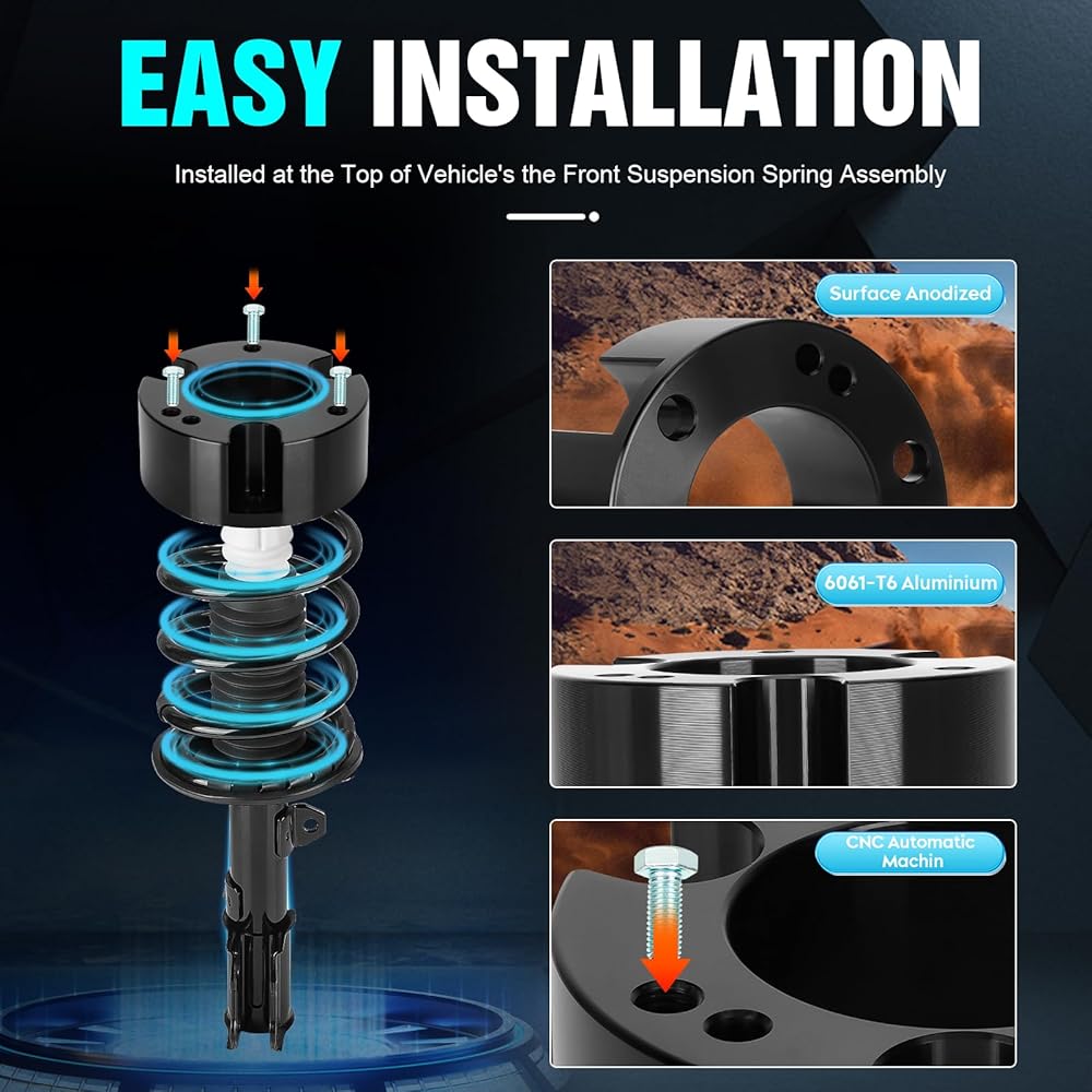 • 【Anti-Corrosion & Durable】:The leveling lift kit is made of 6061-T6 aluminum alloy and 12.9 grade solid bolts, CNC automatic processing for better durability. The surface treatment is anodized black, which is not easy to rust and lasts longer