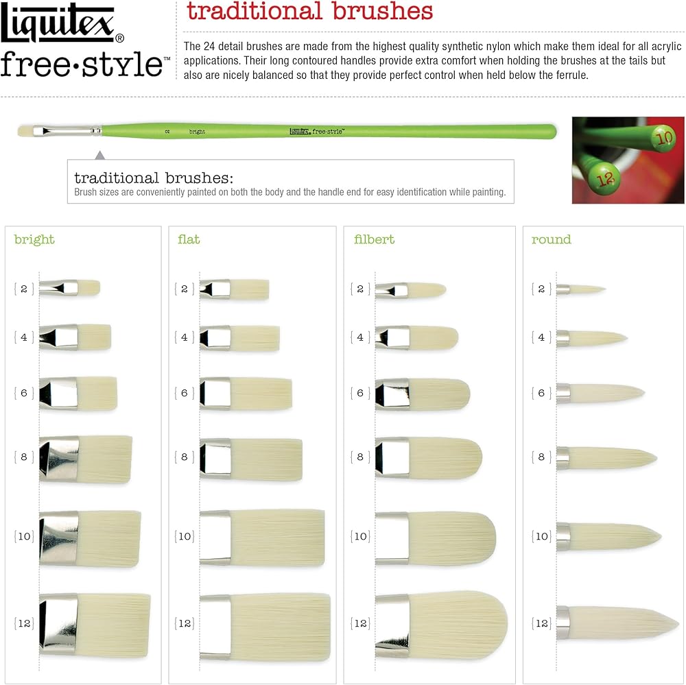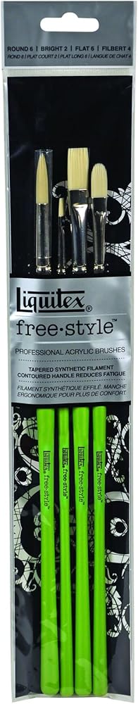 At Liquitex, we understand that it takes more than just good paint to produce a truly great piece of art. That's why we've created our professional range of artist brushes. Liquitex Freestyle Brushes are the perfect tools for virtually any artistic application. Designed by artists for artists, these brushes have unique ergonomic handles and strong synthetic bristles that make them both comfortable and durable. Liquitex Freestyle Traditional Brushes are made from the highest quality, synthetic nylon which make them ideal for all acrylic applications. Their long contoured handles provide extra comfort when holding the brushes at the tails while nicely balanced to provide perfect control when held below the ferrule. 4-Piece Set Contents: 1 each of Round #6, Bright #2, Flat #6, Filbert #4. Visit our Liquitex Amazon Storefront for full product assortment.
