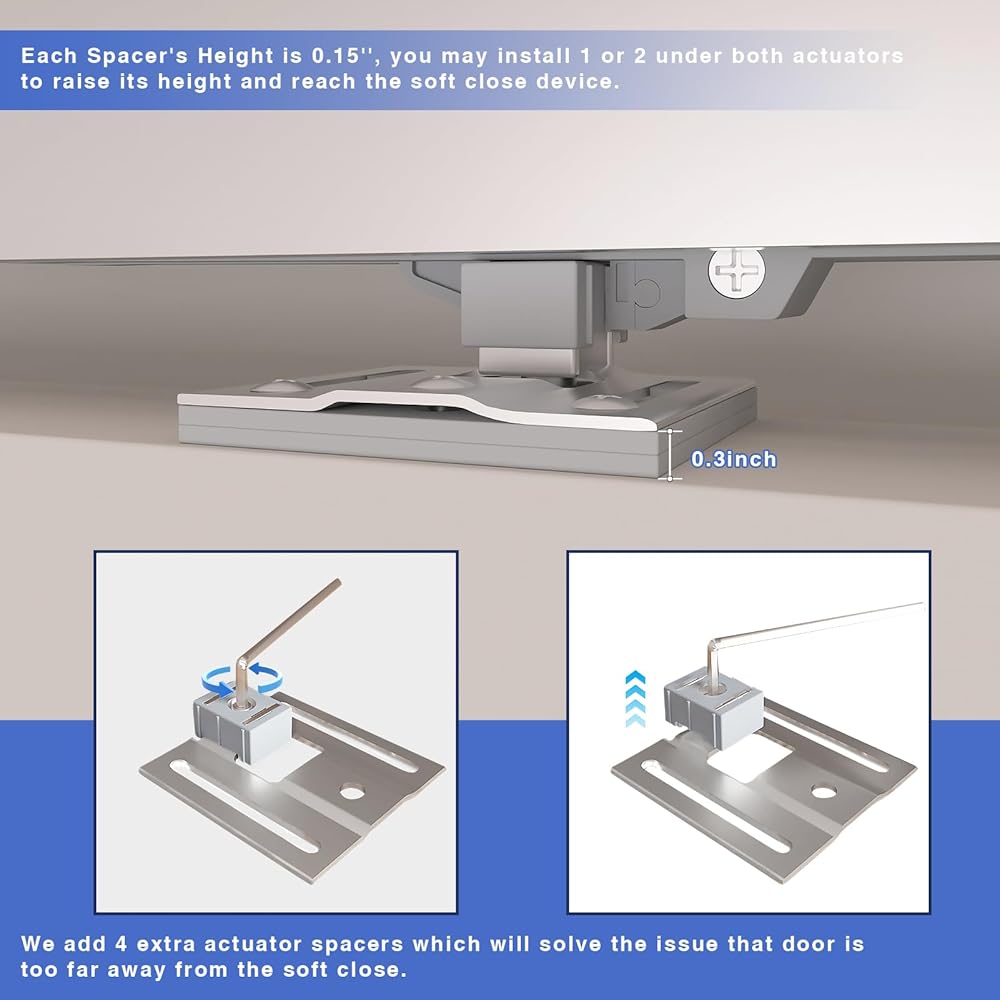 【ما يجعلنا مختلفين】نضيف 4 فواصل إضافية للمشغل والتي ستحل مشكلة كون الباب بعيدًا جدًا عن الإغلاق الناعم. يبلغ ارتفاع كل فاصل 0.15 بوصة، ويمكنك تركيب 1 أو 2 تحت كلا المحركين لرفع ارتفاعه والوصول إلى جهاز الإغلاق الناعم. يوفر المحرك المُطوَّر إمساكًا أكثر استقرارًا مع الإغلاق الناعم أثناء فتح الأبواب أو إغلاقها.