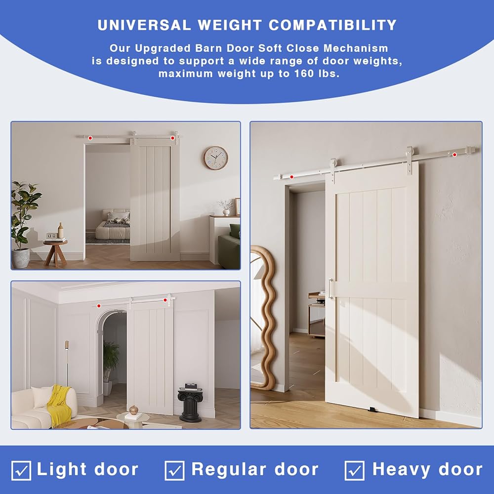 【توافق الوزن العالمي】: تم تصميم آلية الإغلاق الناعم لباب الحظيرة المطورة لدعم مجموعة واسعة من أوزان الأبواب، بما في ذلك الأبواب التي يصل وزنها إلى 160 رطلاً، سواء كان بابًا خفيفًا أو بابًا عاديًا أو بابًا ثقيلًا. استمتع بمرونة استخدامه مع أحجام الأبواب والمواد المختلفة. يحافظ هذا الموضع المخفي لآلية الإغلاق الناعم على جماليات باب الحظيرة مع توفير الوظيفة والراحة.