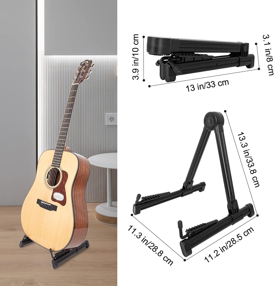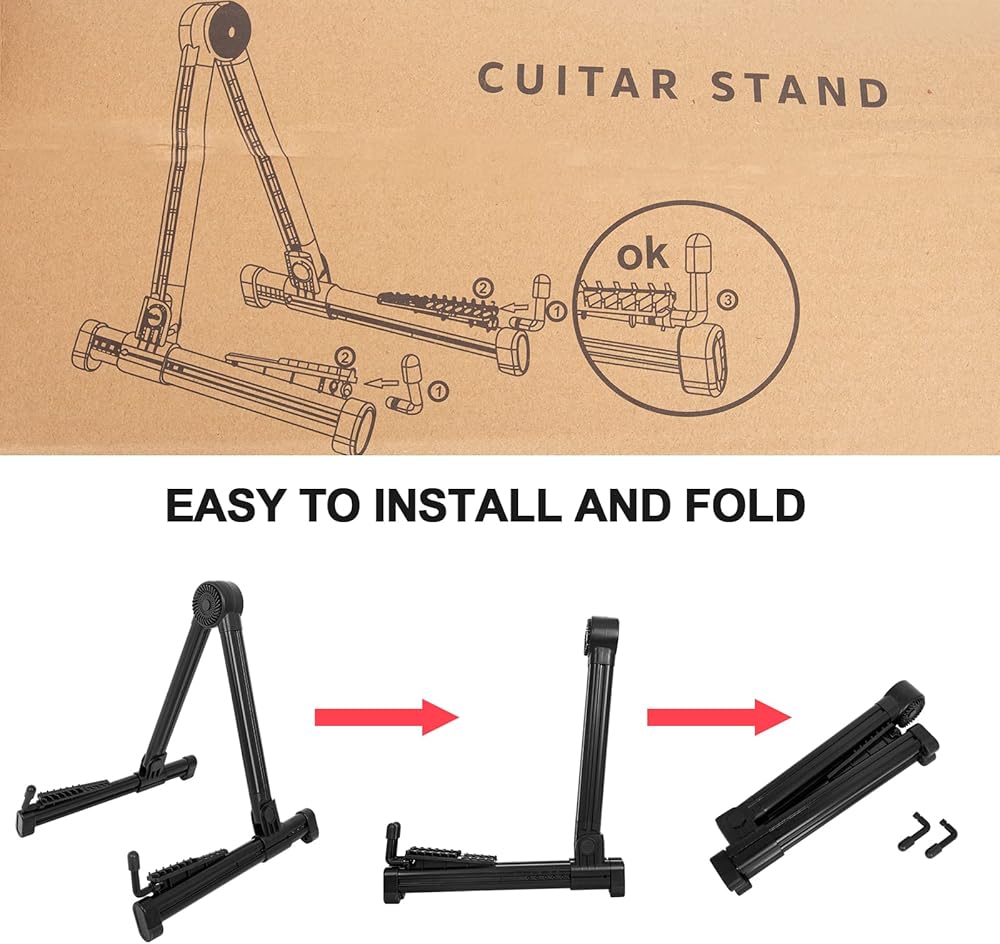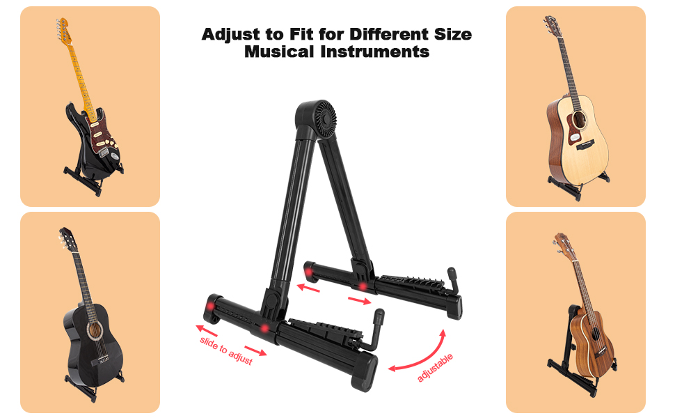 • حامل جيتار عالمي: يمكن تعديل قضيب مسند الظهر المتحرك وطول أرجل حامل الجيتار ليناسب الأدوات ذات الأحجام المختلفة، ويمكن استخدام حامل الجيتار هذا كحامل جيتار صوتي، وحامل جيتار كلاسيكي، وحامل جيتار كهربائي، وحامل جيتار خشبي، وبانجو حامل، حامل المندولين، حامل الكمان، حامل التشيلو والمزيد. يعمل حامل الجيتار ذو الإطار A بشكل جيد لعرض الآلة الموسيقية الوترية.