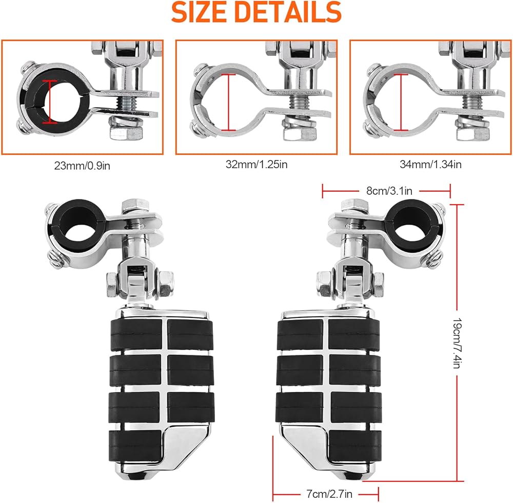 الملاءمة◀ ◀ أوتاد الطريق السريع للدراجات النارية تناسب عالميًا طراز Harley Touring: Softail، Dyna، Electra Glide، Road King، Roar Glide، CVO، Street Glide 1 1/4 بوصة (32 مم) قضبان حماية المحرك؛ عالمية لسوزوكي ياماها كاواساكي: كروزر Chopper Cafe Racer مع مشبك أنابيب دائري 1 بوصة (25 مم) إلى 1 1/3 بوصة (34 مم)؛ مناسب لجميع الدراجات النارية مع قطر داخلي لمشبك التثبيت 1 بوصة (25 مم)، 1 1/4 بوصة (32 مم)، 1 1/ 3 بوصة (34 ملم) مناسبة.