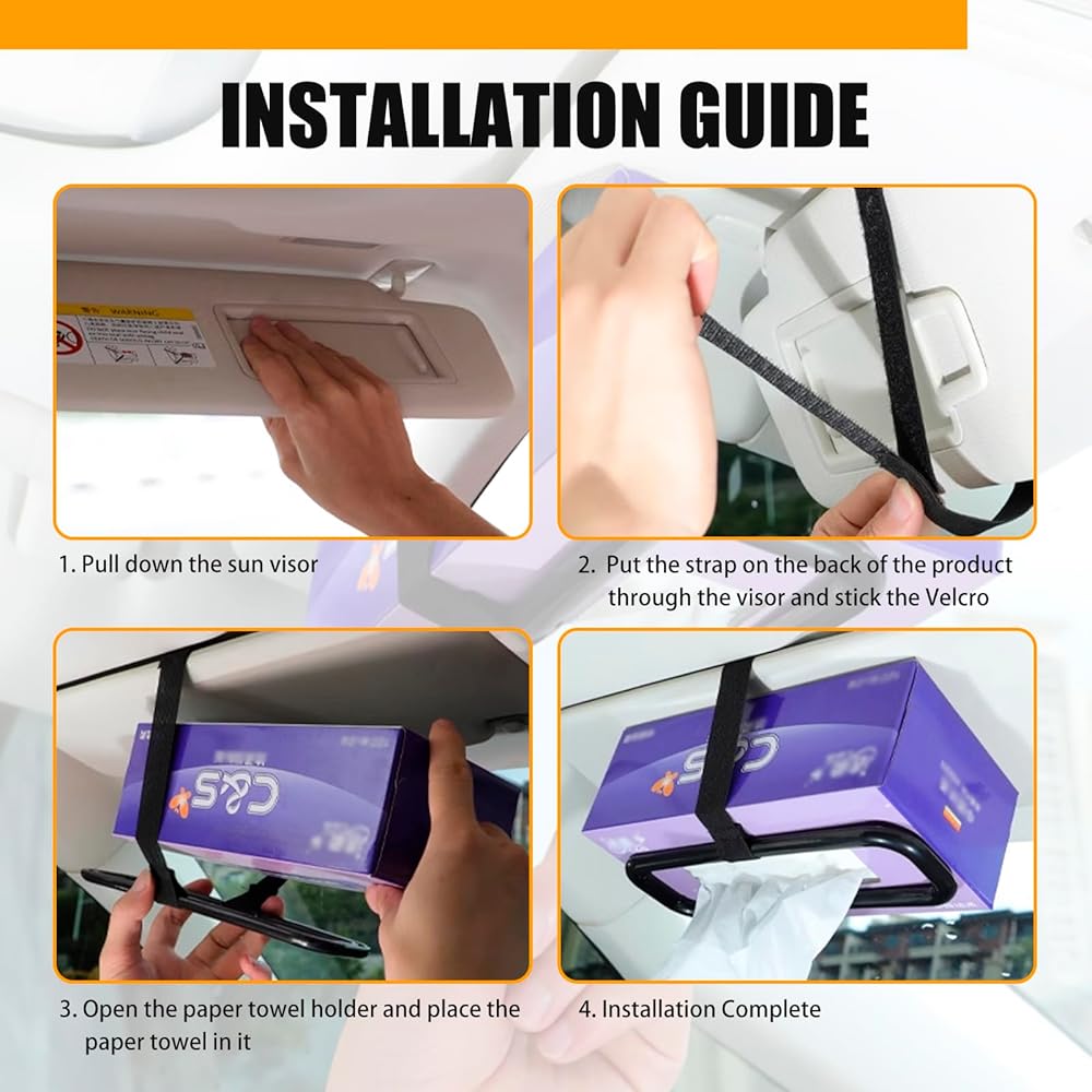 Easy to Install: When installing, directly tie the paper towel box to the visor board, adjust the length of the elastic belt to fix the tissue box.If you have any question on use, kindly contact us at any time directly, we will solve the problem for you within 24 hours on weekdays.