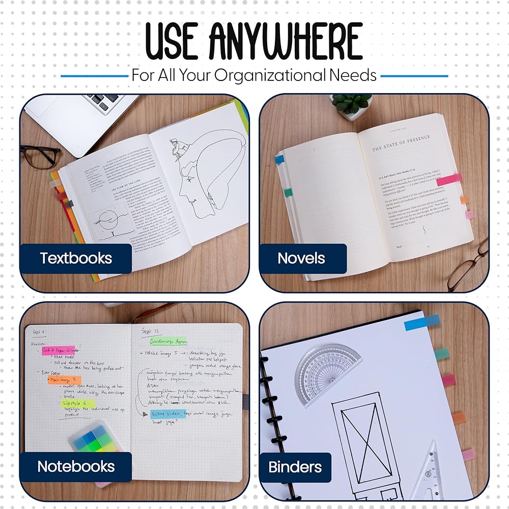 • ابق على اطلاع دائم بملاحظاتك - قم بتمييز النص المهم أو الإشارة المرجعية بسهولة باستخدام علامات تبويب الملاحظات اللاصقة المكونة من 5 ألوان للكتب والمستندات! تصميمها الشفاف غير اللامع يجعل التنظيم سهلاً مع ضمان الوضوح.