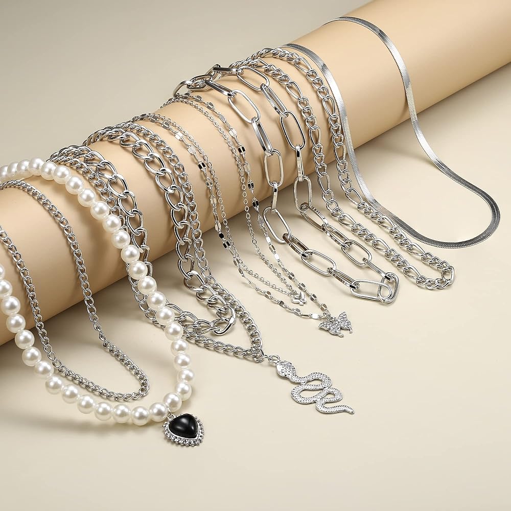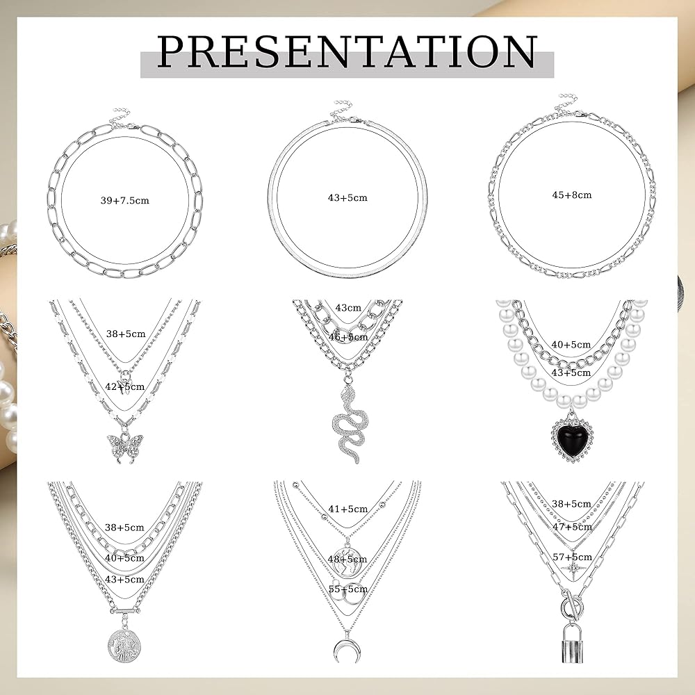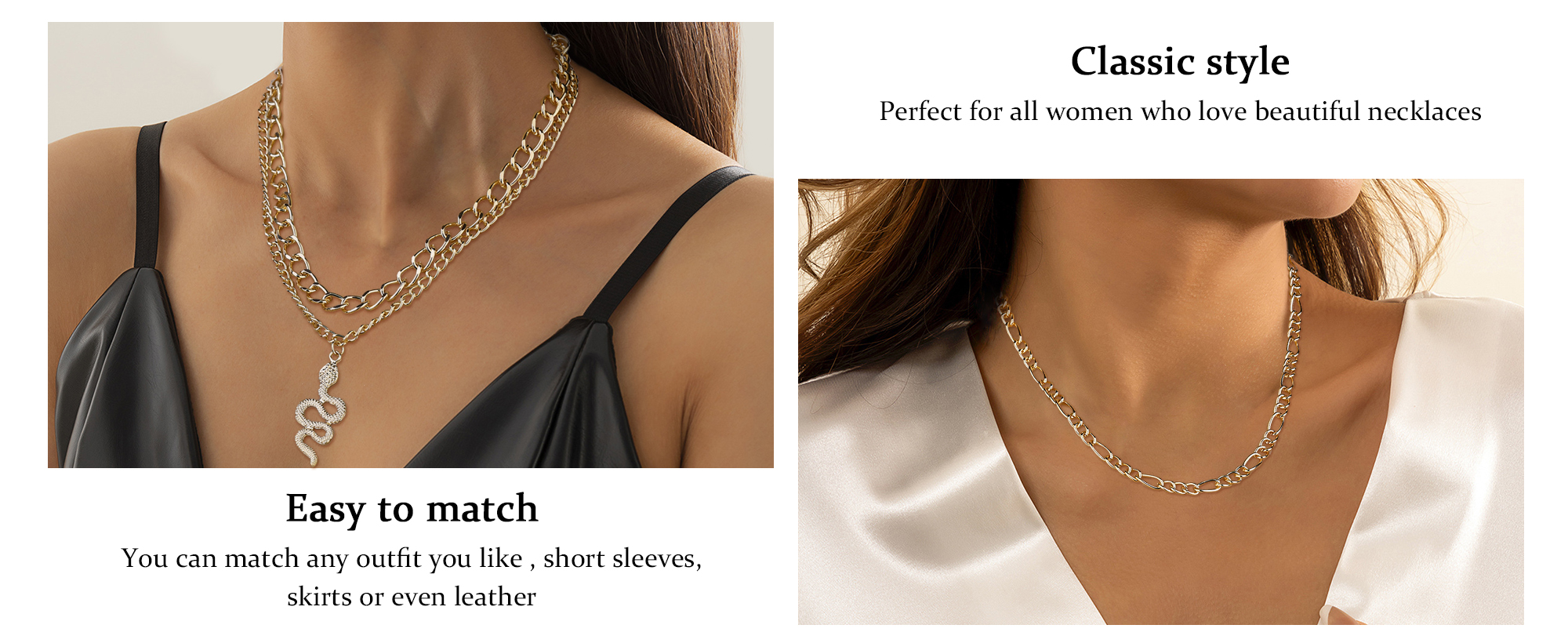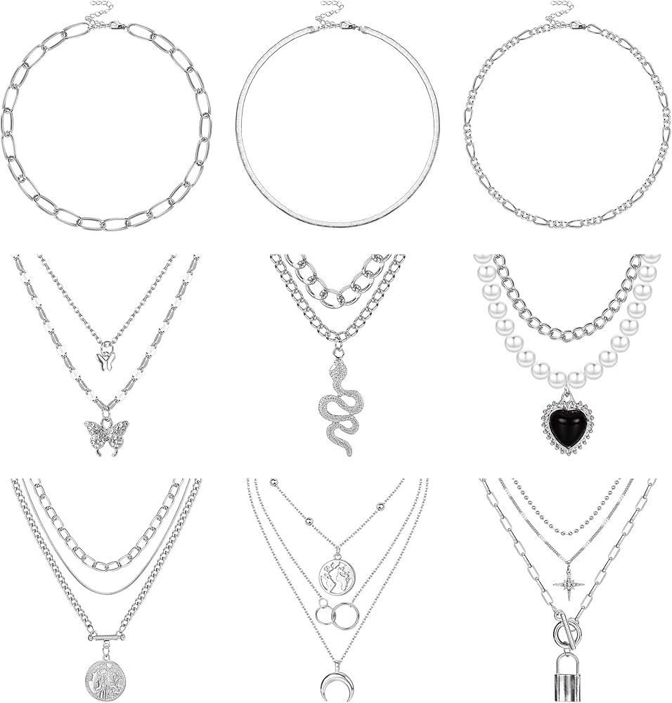 • مجموعة قلادات ذهبية: تحتوي كل مجموعة على 9 قطع من قلادات السلاسل الرائعة المطلية بالفضة، بما في ذلك 3 قطع من قلادات مكتنزة وقلادة سلسلة ثعبان وقلادة بدلاية على شكل فراشة وقلادة على شكل قلب وقلادة على شكل ميدالية متعددة الطبقات وقلادات ذات طبقات بوهيمية وقلادة على شكل سلسلة مدلاة. مجموعة القلادات هذه التي تجمع بين سلسلة واحدة وقلادة مزدوجة الطبقات وتصميم قلادة ثلاثية الطبقات، تمنحك المزيد من خيارات المظهر.