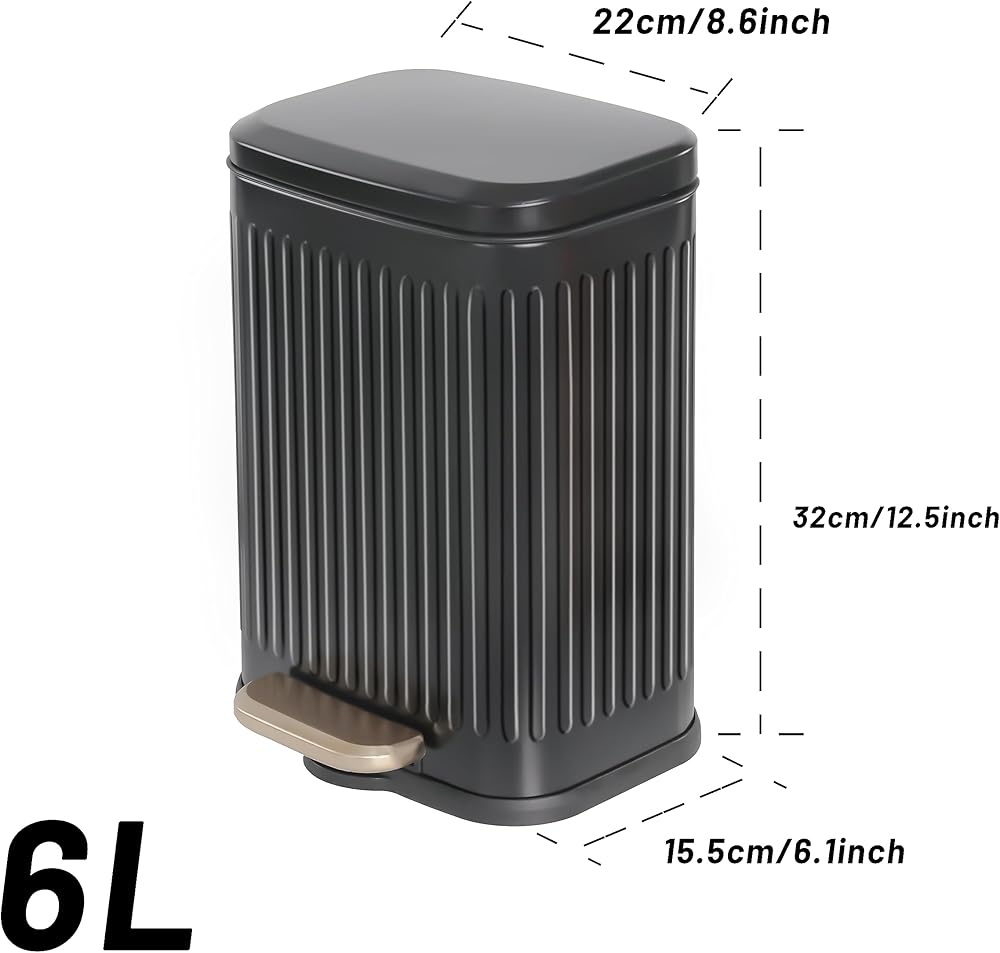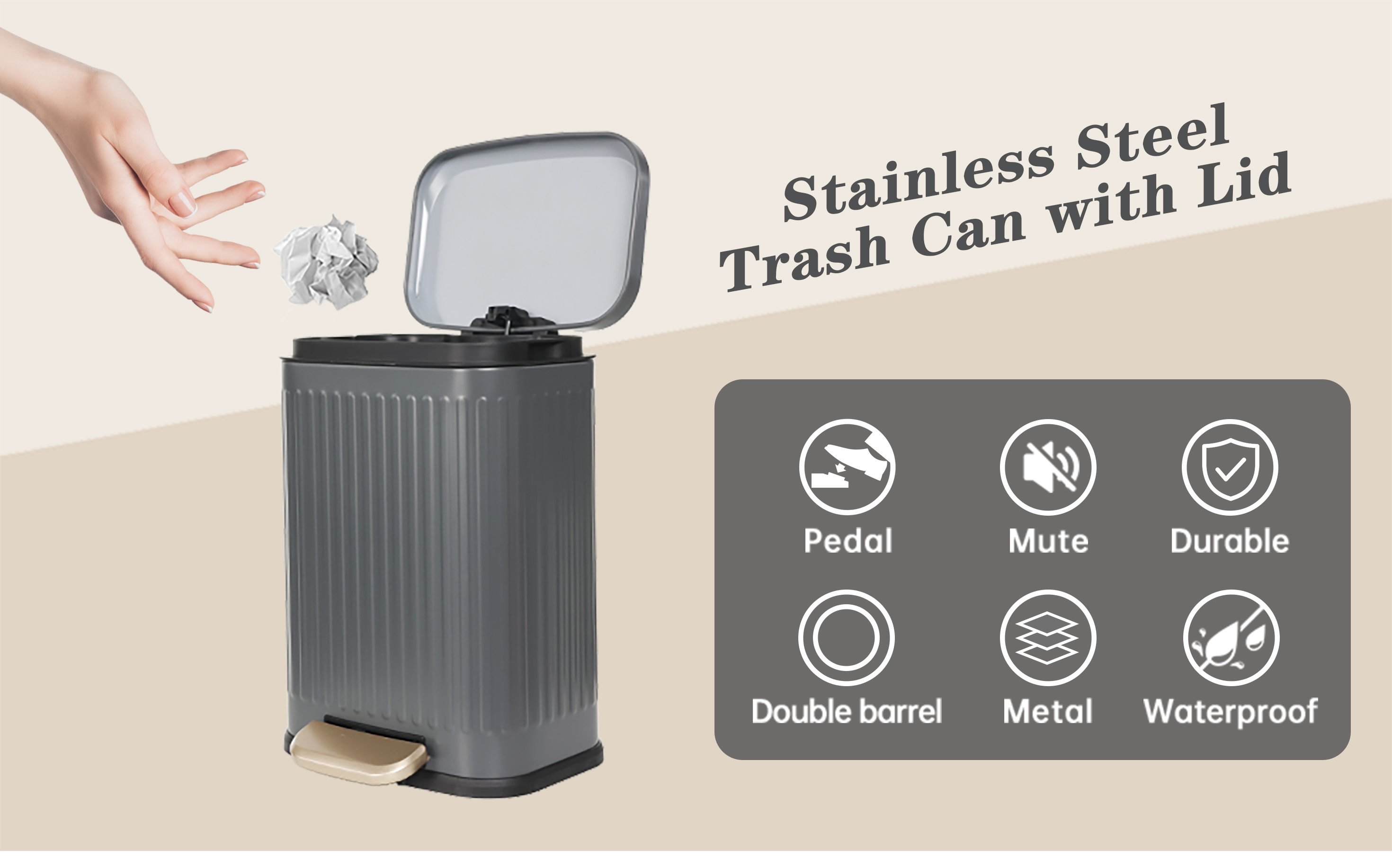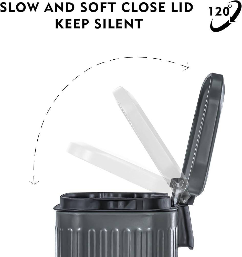 غطاء ناعم الإغلاق ويبقى مفتوحًا - يمكن لقمامة الحمام ذات اللون الرمادي غير اللامع أن تحرر يديك، ويفتح الغطاء ويغلق بسلاسة وصمت بضغطة على الدواسة بهدوء مثل قلب الكتاب، لا تقلق بشأن إزعاج بقية أفراد عائلتك . قم بتثبيت الغطاء عند 90 درجة ليظل مفتوحًا طالما احتجت.