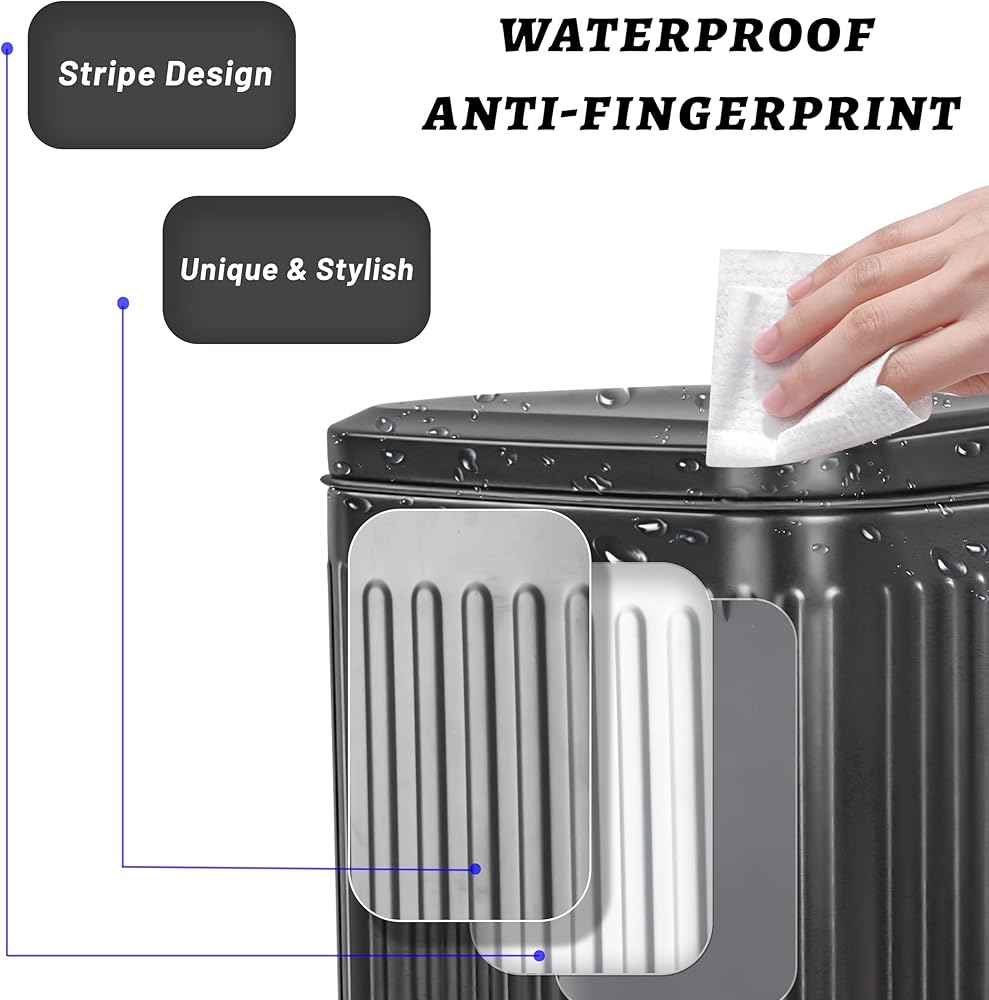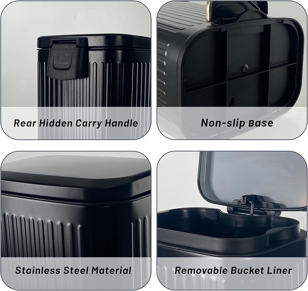 تصميم موفر للمساحة: يمكن وضع سلة المهملات المصنوعة من الفولاذ المقاوم للصدأ بسهولة في المساحات الضيقة وزوايا الحمام بفضل شكلها النحيف؛ مثل الحمام، وغرفة النوم، والمكتب، والمرحاض، وغرفة الأطفال، وغرفة المسحوق، والمزرعة، والشقق، والتخييم، والمركبات الترفيهية، وغرف النوم، إلخ.