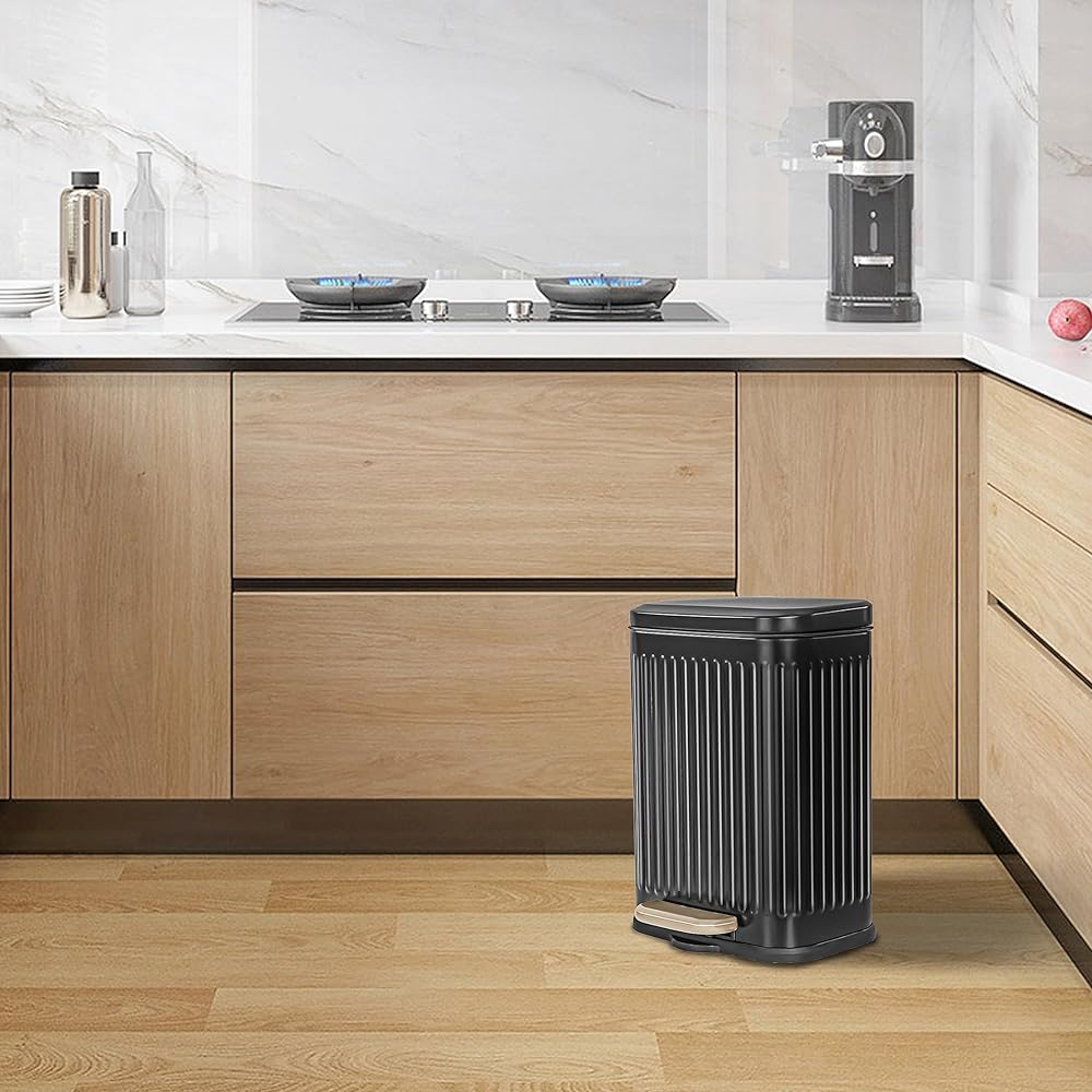 دلو داخلي قابل للإزالة: يوجد مقبض حمل في الجزء الخلفي من سلة مهملات المطبخ لتحريكها بسهولة. ويوجد فتحة احتجاز مصممة في الدلو لقفل كيس القمامة في مكانه وإخفاء كيس القمامة الإضافي، مما يجعل أكثر جمالاً وجمالاً. رائع.