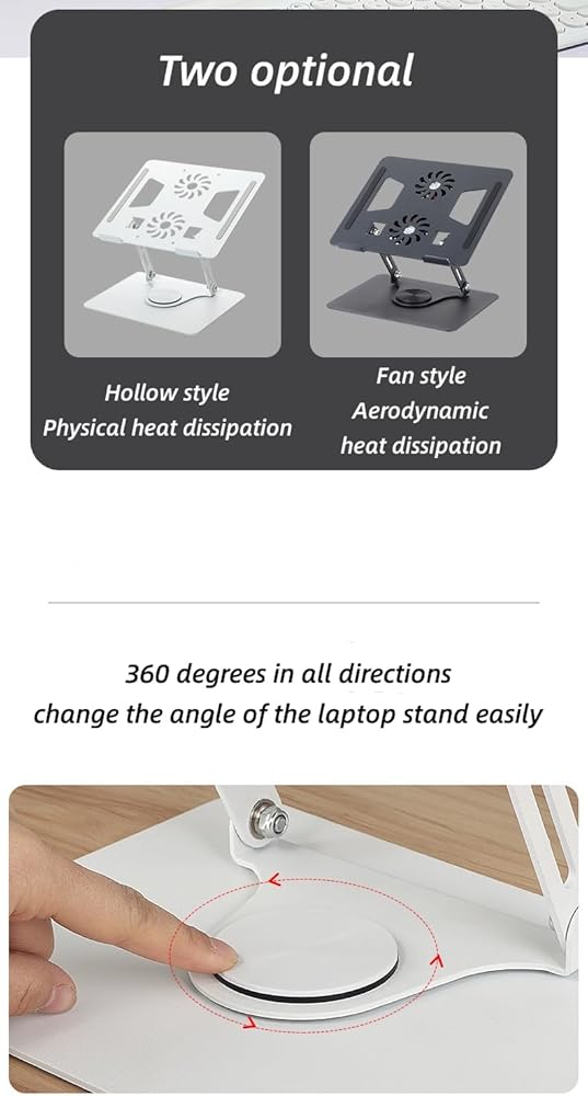 360-DEGREE ROTATION: This stand features a rotating mechanism that allows the laptop to be swiveled a full 360 degrees horizontally. This enables users to adjust the viewing angle and position of the laptop according to their preference, whether for work, entertainment, or presentations.