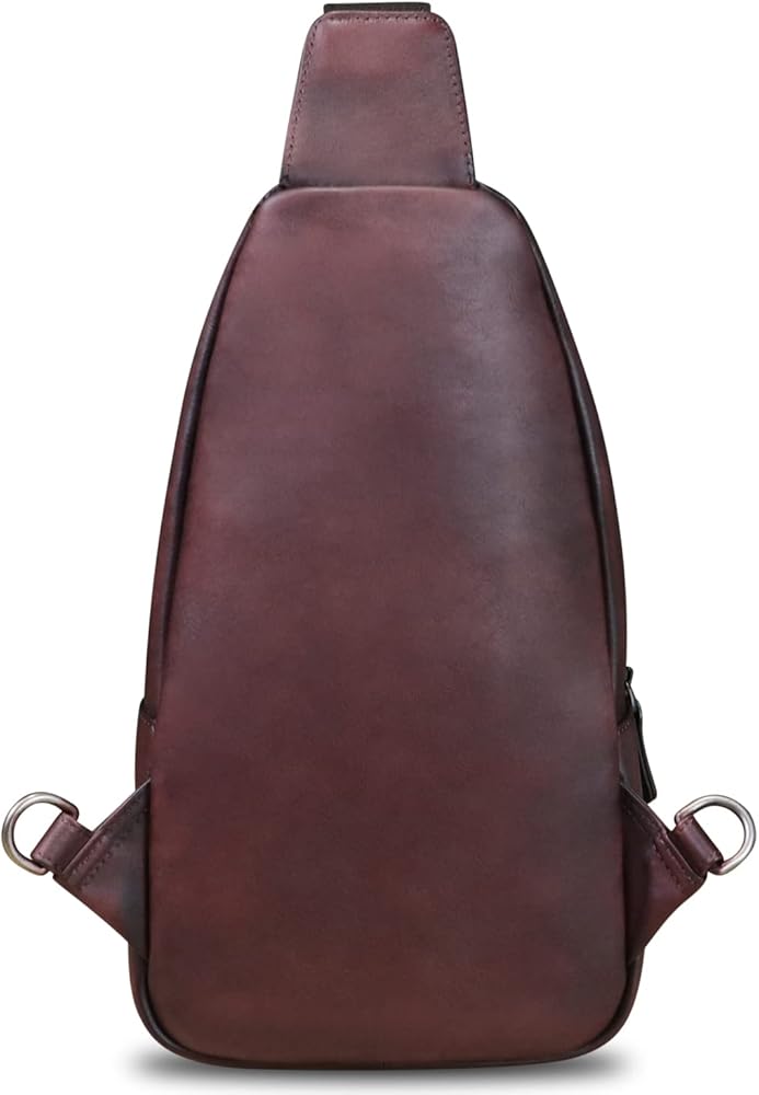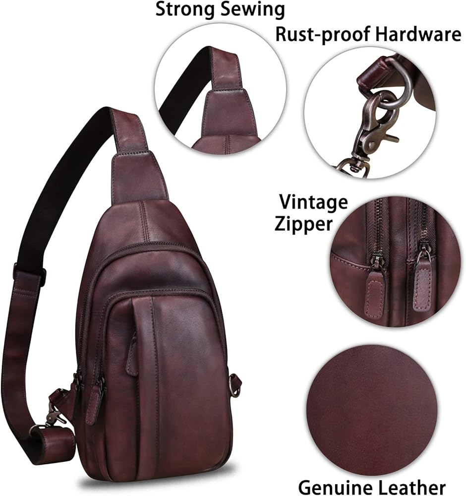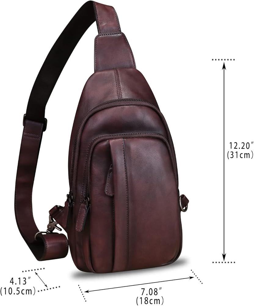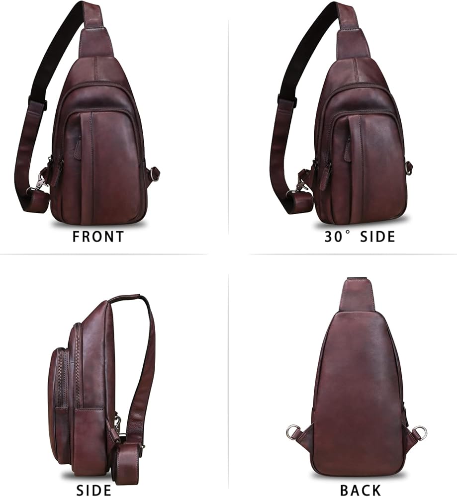 This sling bag is made manually from the genuine leather. After a special coloring process, it made a unique retro style. Because of the special nature of natural leather and the coloring process, each bag is unique.