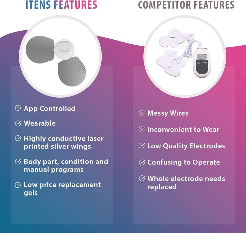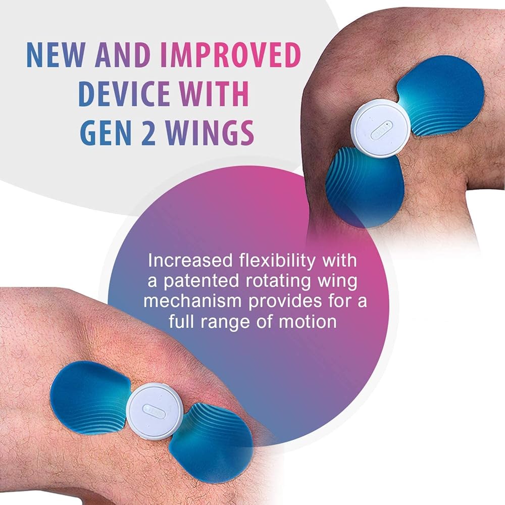 أجنحة دوارة فائقة المرونة - يستخدم هذا الجيل الثاني من iTENS تصميم جناح دوار جديد تمامًا يمنح 360 درجة من الحركة لنطاق كامل من الحركة. أصبحت الأجنحة الجديدة أرق وأكثر مرونة من أي وقت مضى لتحقيق أقصى قدر من الراحة والفائدة مع سطح موصل فضي مطبوع بالليزر.