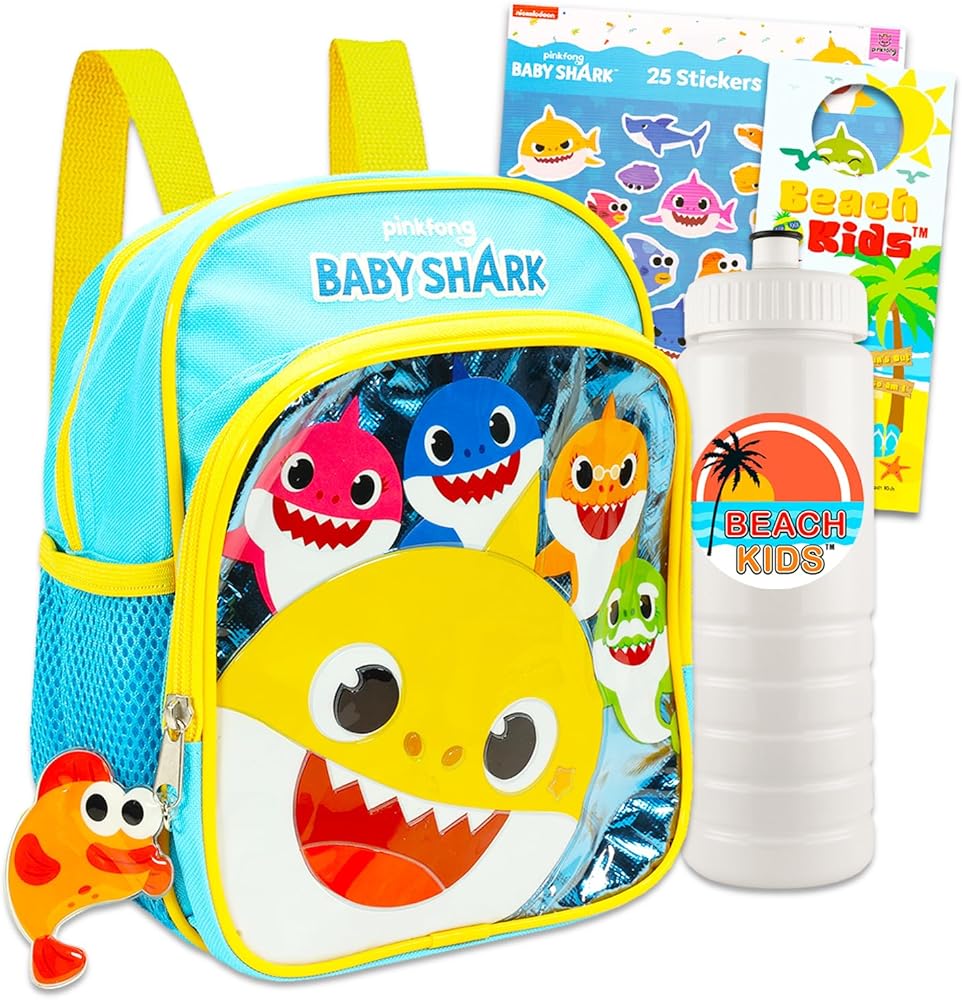 • This Baby Shark backpack for toddlers includes adjustable shoulder straps, zip closure compartment, and top loop for hanging. This Baby shark small backpack bundle also includes a Beach Kids water bottle to help you stay hydrated all day.