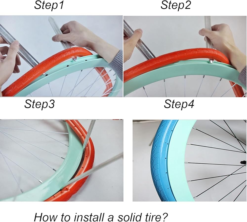كيفية تركيبه؟ أولاً، قم بنقع الإطار الصلب في ماء دافئ لمدة 5-10 دقائق أو بعد تنعيمه في الشمس، يمكن تركيبه بسهولة باستخدام ملعقة إطار حديدية أو مفك براغي مسطح. نوصي باستخدام روابط مضغوطة وممتدة مسبقًا ورافعتين معدنيتين للإطارات.