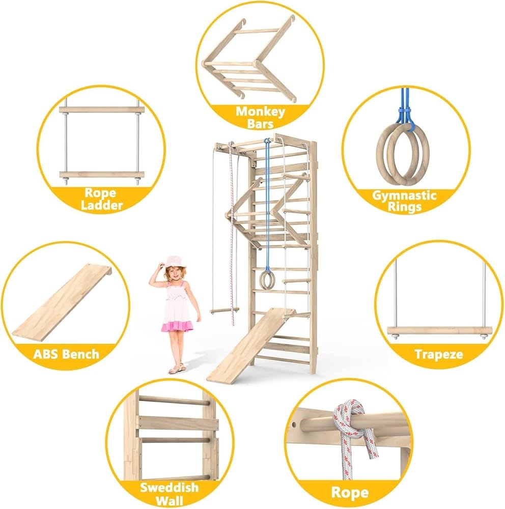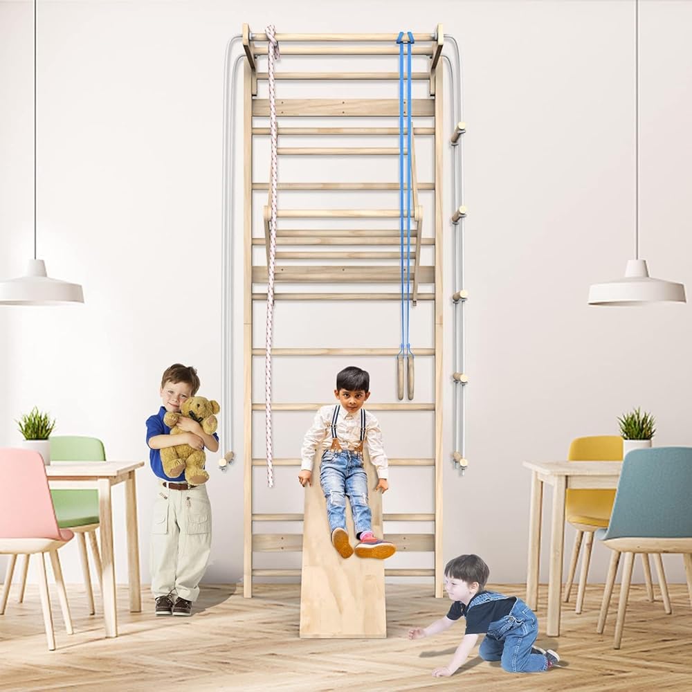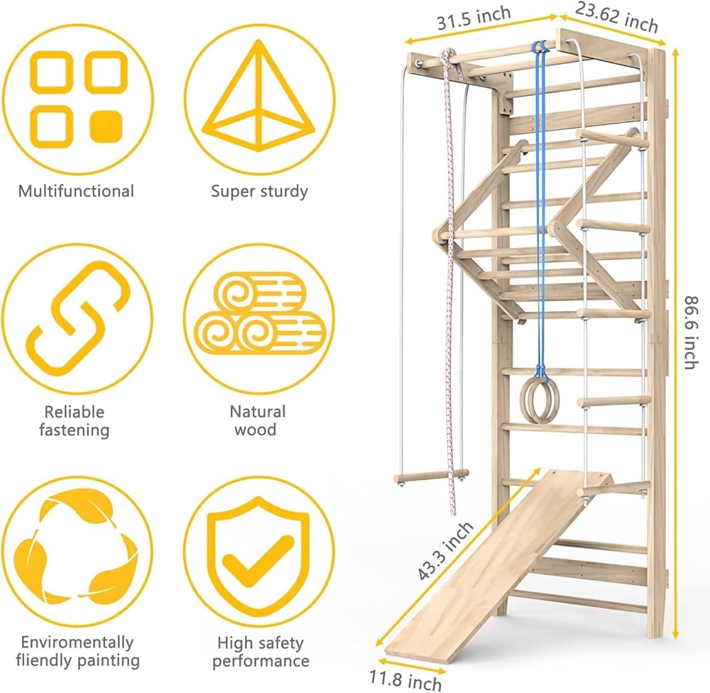 Upgraded Jungle Gym Swedish Ladder Wall Set : The Swedish Ladder Wall Set with accessories is a fitness station designed for children and adults, providing fun for your child as they climb, swing, balance, hang and slide. It is the perfect toy to accompany your baby as he or she grows. The equipment also comes with ropes, rings, rope swings, rope ladders and a removable bar for children.