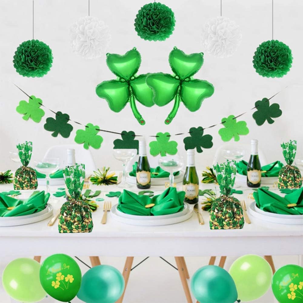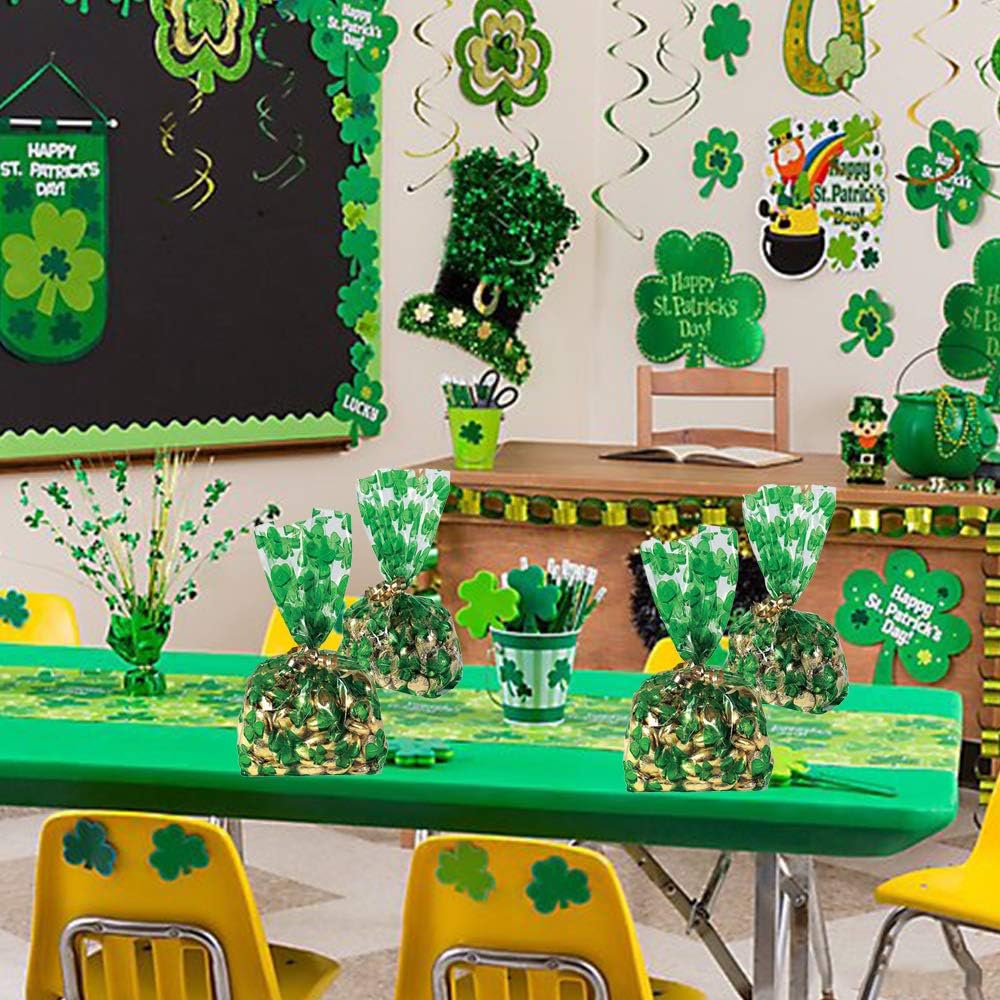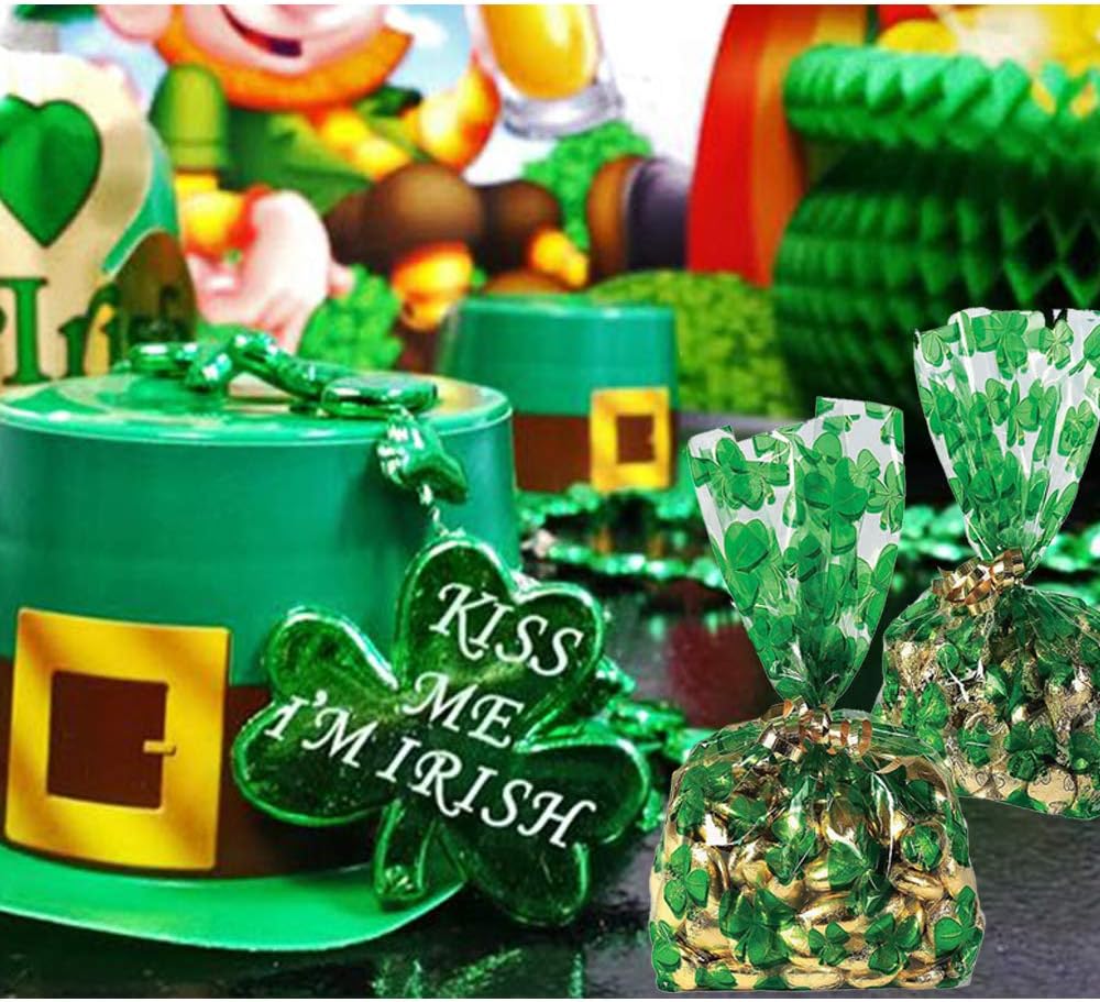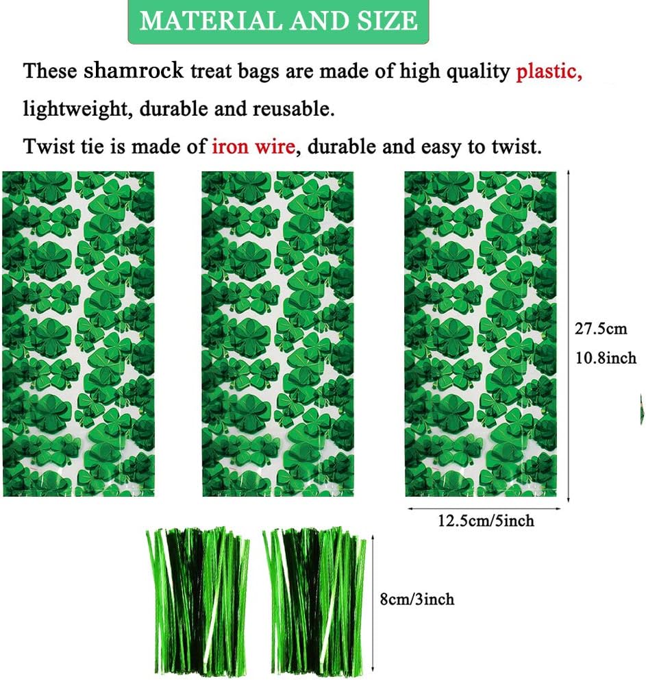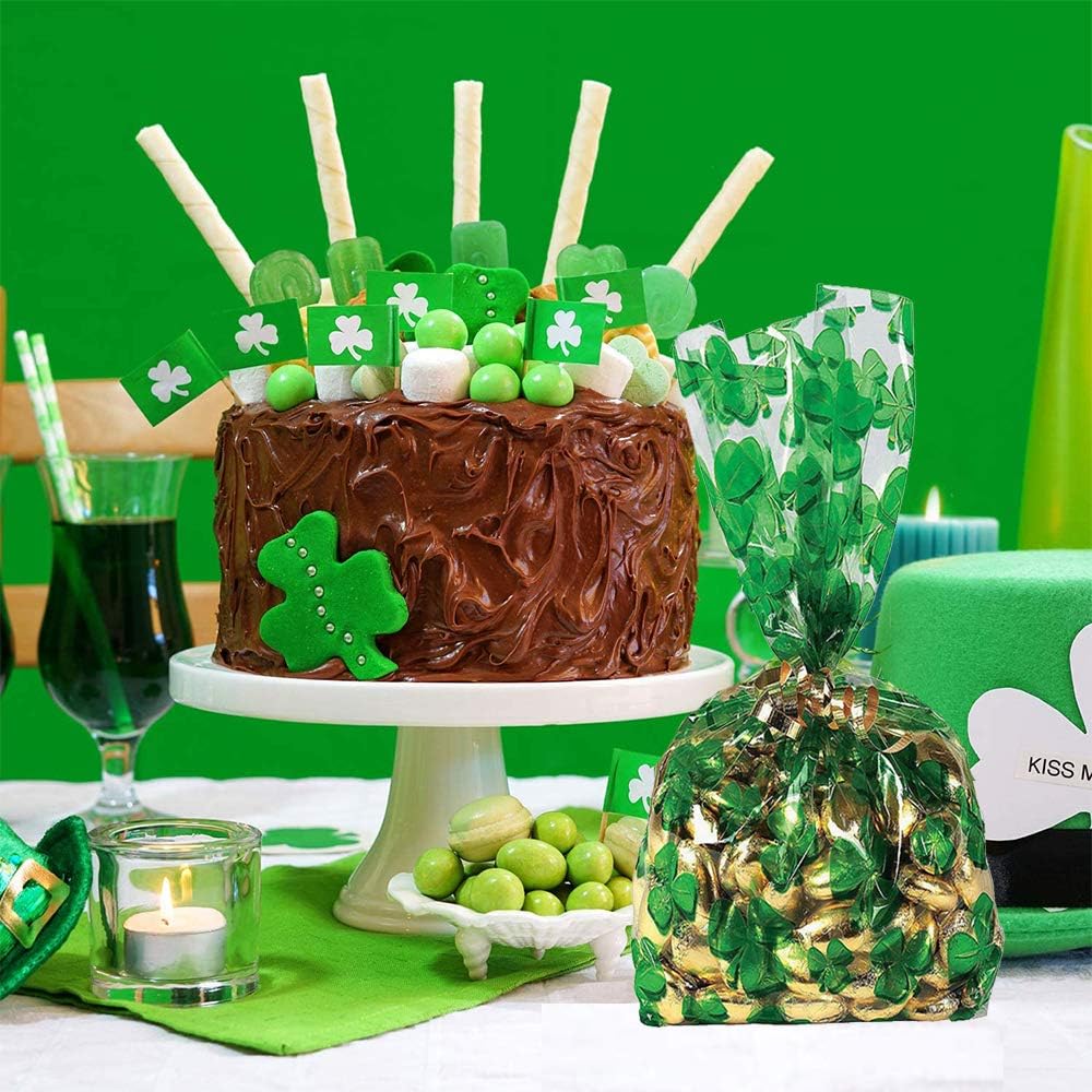 ☘️St. Patrick's Day Supplies for your Event! The St. Patrick's Day Goody Bags are a fun way to spread St. Pats spirit. Includes 100PCS shamrock cellophane bags, each pack size 10.8" x 5"/27.5 x 12.5cm.
