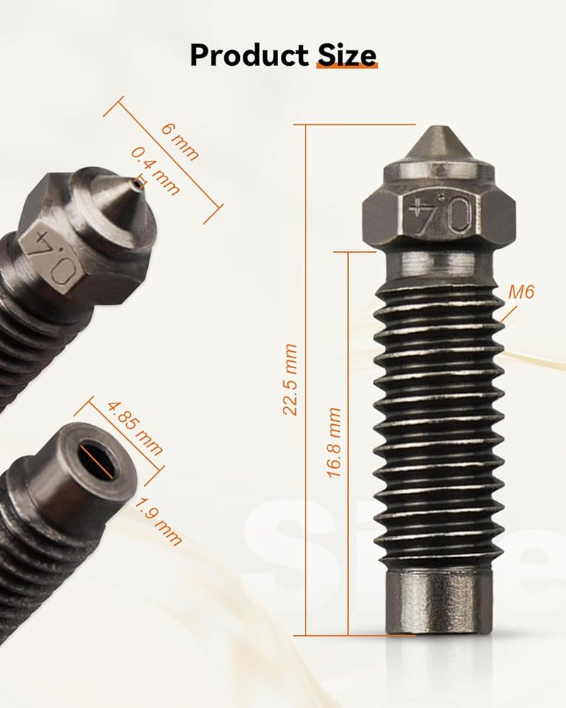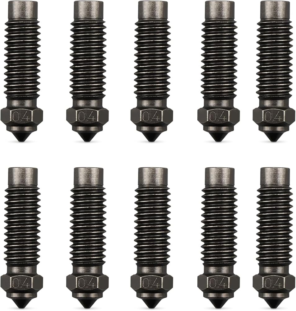 Package Contents: 10 0.4mm hardened steel nozzles, M6 spiral pattern on the outside, easy to install