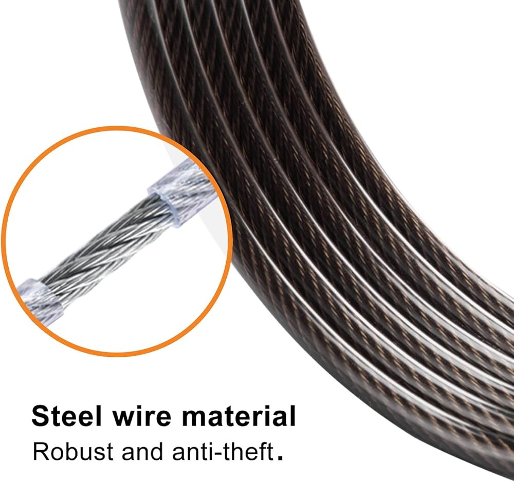 2. المواد: قفل الدراجة مصنوع من سلك فولاذي مضفر وله طلاء فينيل (PVC) يطيل عمر الخدمة للمساعدة في منع الخدوش أو التآكل الناتج عن درجات الحرارة العالية.