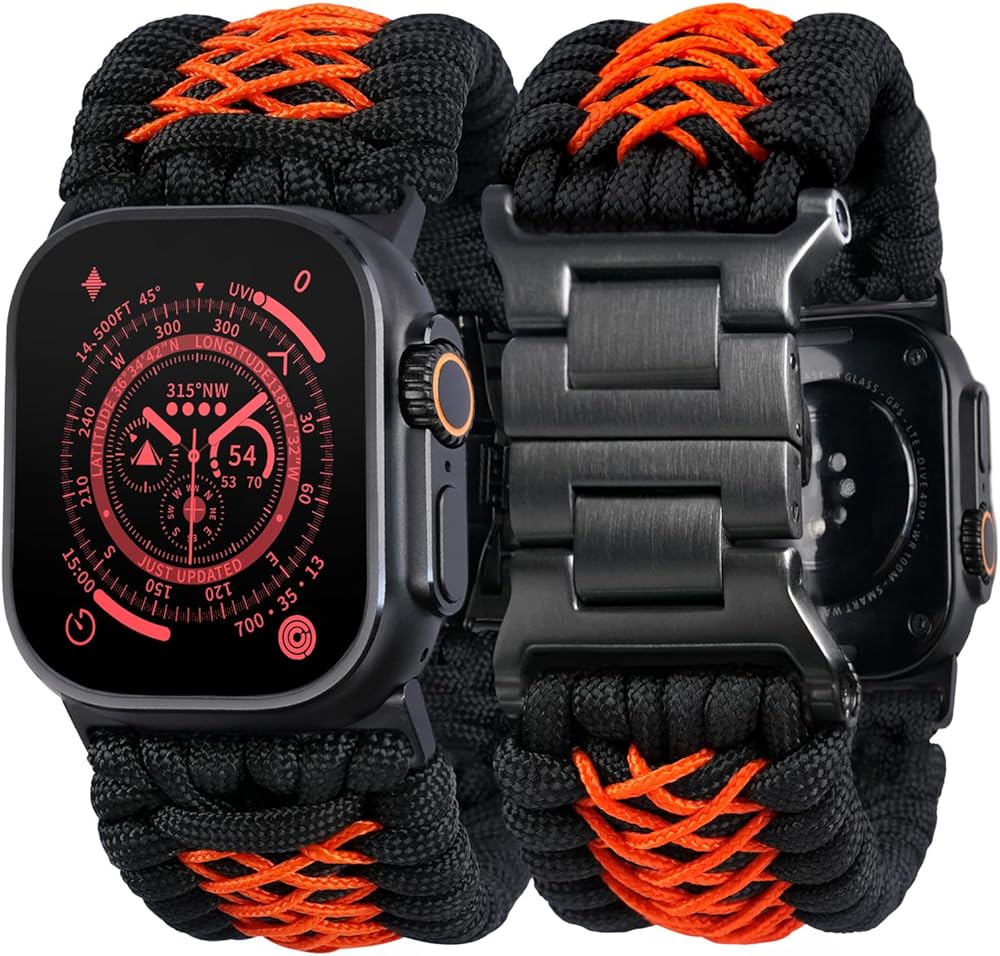 Discover the unmatched blend of ruggedness and elegance with Tefeca Titan Series Paracord band Compatible with Apple Watch . Each band is a bold statement, boasting an ultra-wide 33mm design that sets a new precedent for style and resilience in the world of smartwatch accessories. Crafted from high-grade 550 paracord interwoven with the strength of 316L stainless steel alloy, this band offers a rugged yet refined aesthetic that complements any look. It's built to endure the rigors of everyday use while maintaining a sleek, sophisticated appearance that's sure to turn heads. The Tefeca Titan series stands apart with its innovative butterfly clasp, providing an easy-on, easy-off experience that's as practical as it is stylish. Say goodbye to the cumbersome fitting of traditional bands; Engineered for versatility, our band comfortably fits wrist sizes from 6 1/2" to 8 1/2". And with the included adjustment tool, finding your perfect fit has never been easier. The Tefeca Titan Series Band isn't just an accessory—it's a fusion of functionality and fashion that speaks to the adventurer in you.