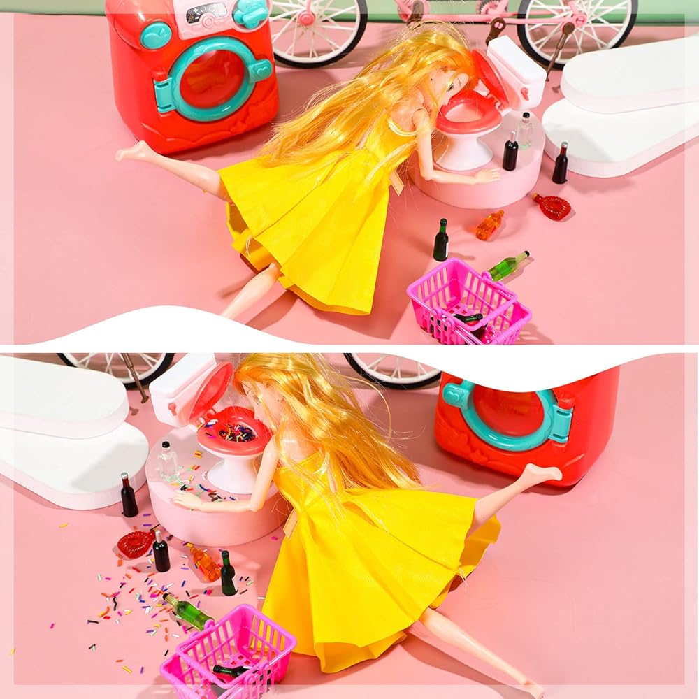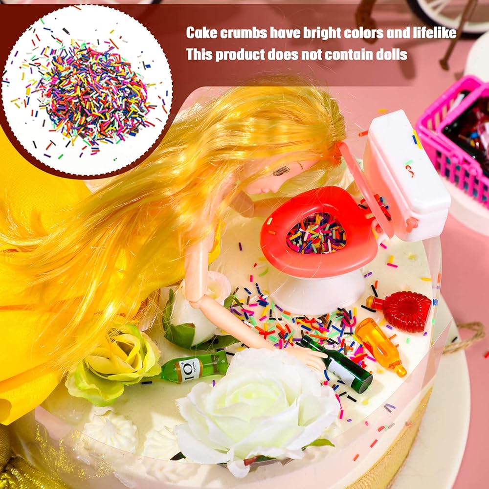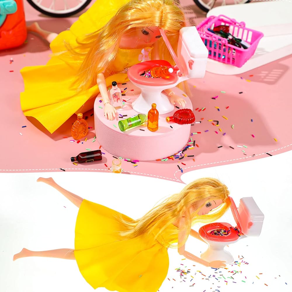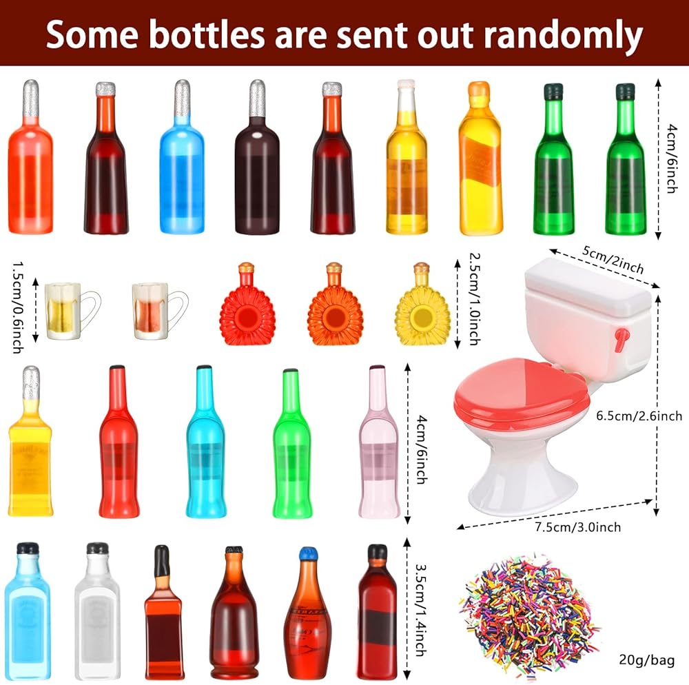 The toy toilet is about 2.36 x 2.76 x 2.95 inches, and the miniature bottles are about 0.75 x 1 inches, the fake cake crumbs are about 20 g in weight, small in size and light in weight, so they are potable to carry and won't take up too much space.