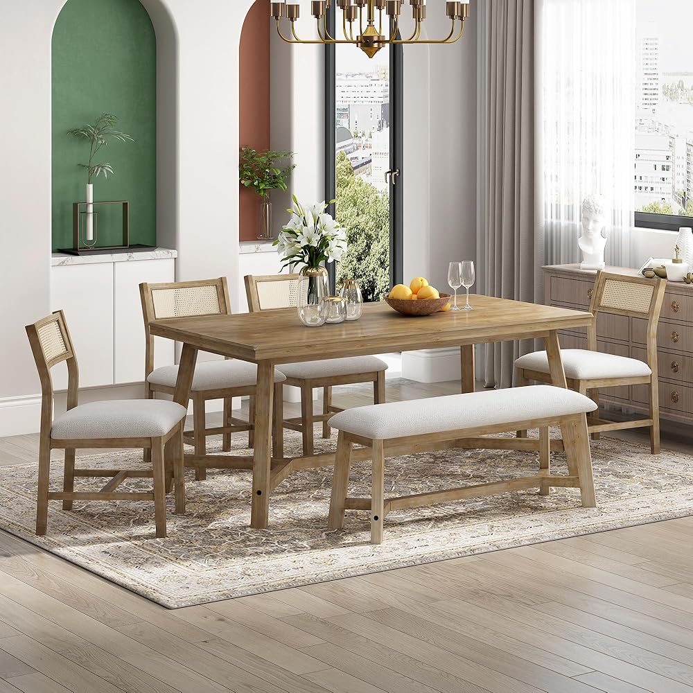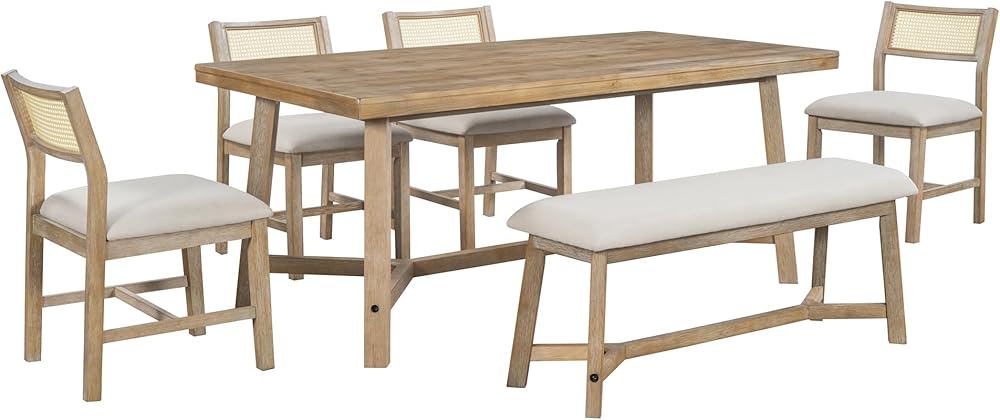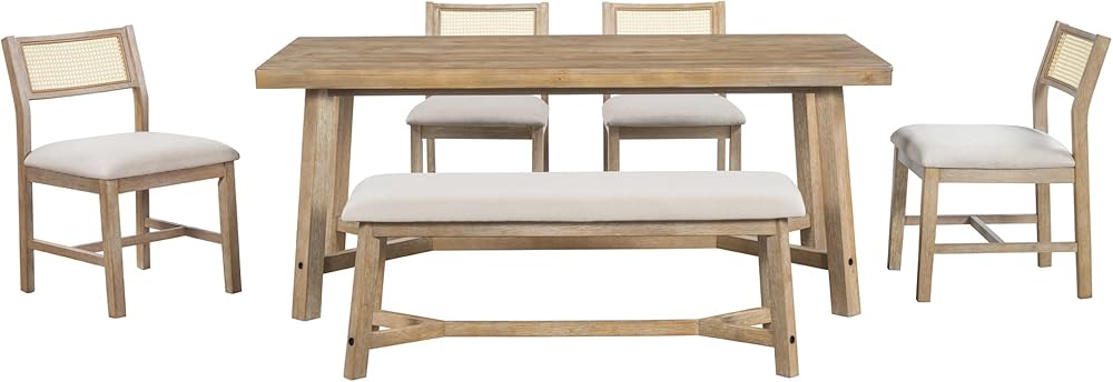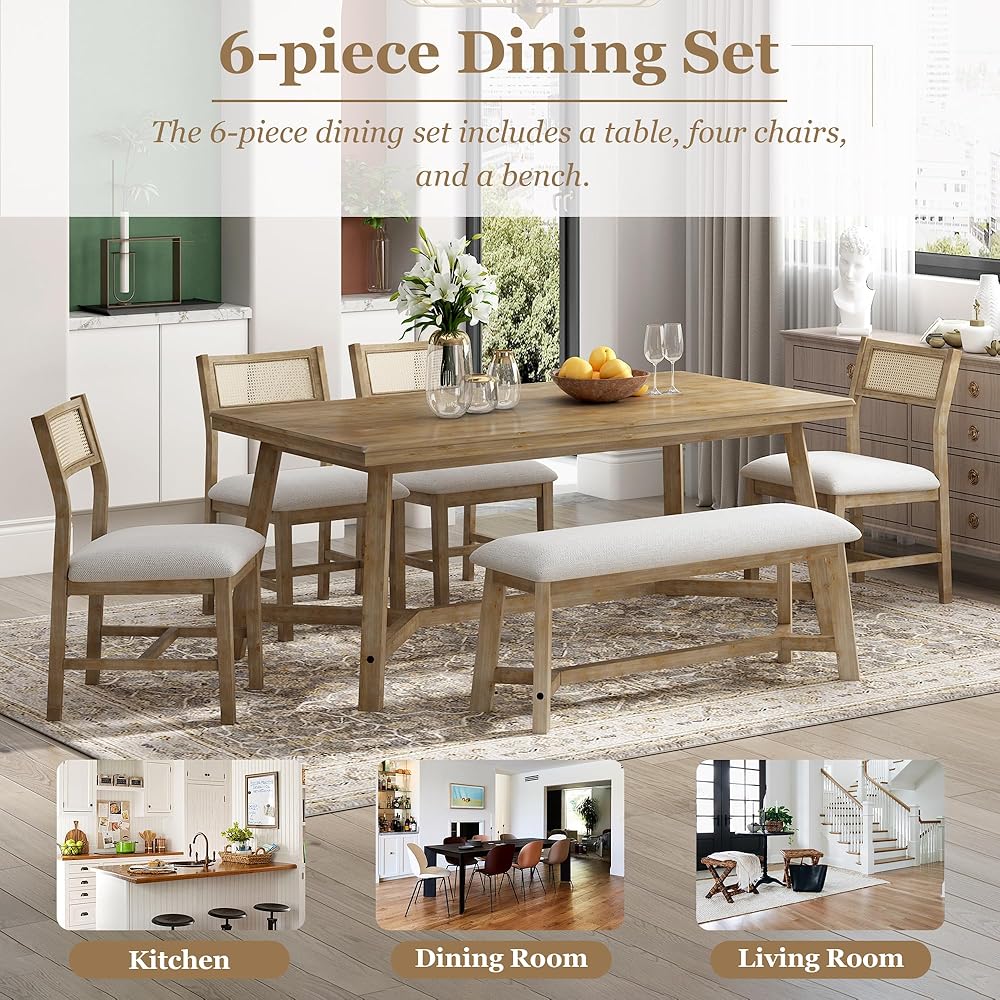 6-piece Dining Set: The 6-piece dining set includes a table, four chairs, and a bench. The wooden textured tabletop is paired upholstered chairs with rattan, and every scar on the tabletop exudes a strong retro farmhouse style. Whether placed in the kitchen, dining room or living room, it can perfectly match your decoration style and is undoubtedly a unique and exquisite addition to your home.
