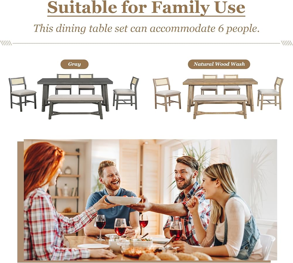 Suitable for Family Use: Natural wood wash and gray are available for you. This dining table set can accommodate 6 people. You can use it to enjoy a hearty dinner with your family and have a nice and relaxing conversation. Designed with simple lines and a classic shape, the dining set will fit any size area and add a touch of sophistication to your dining room.