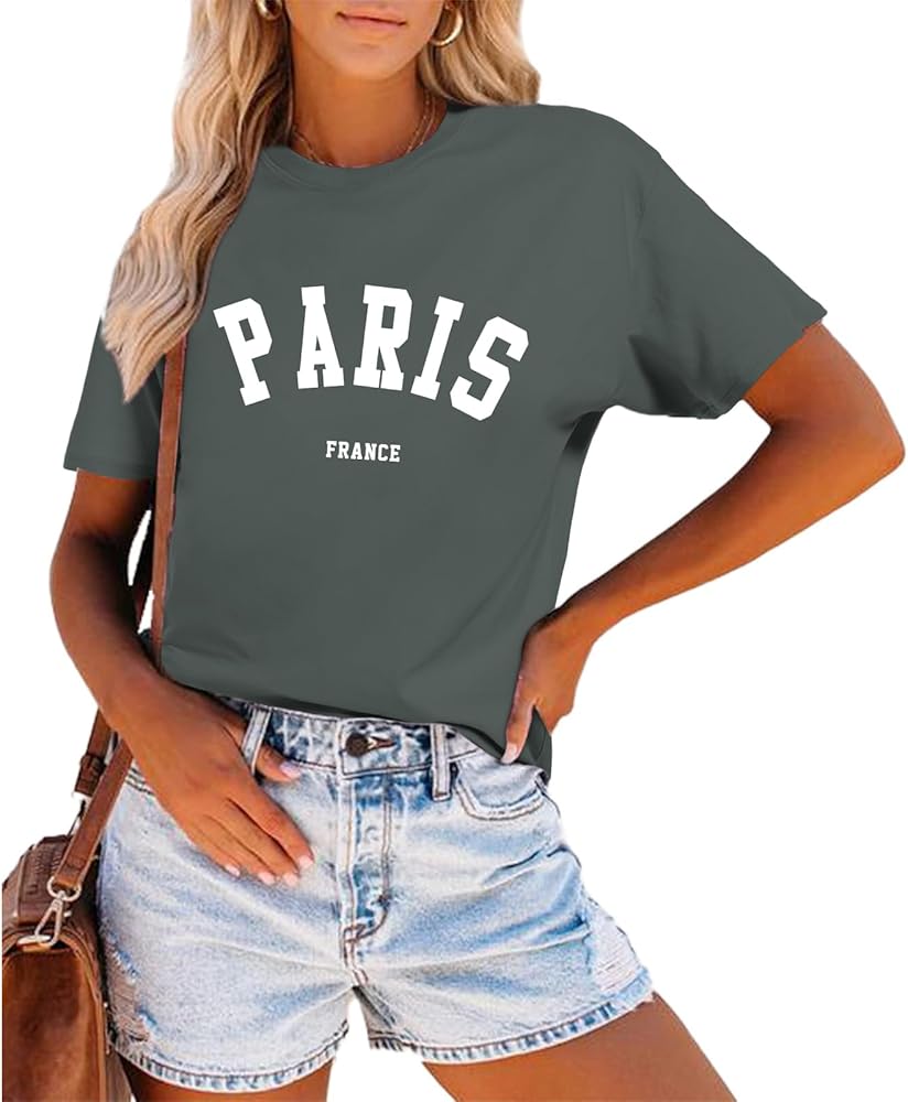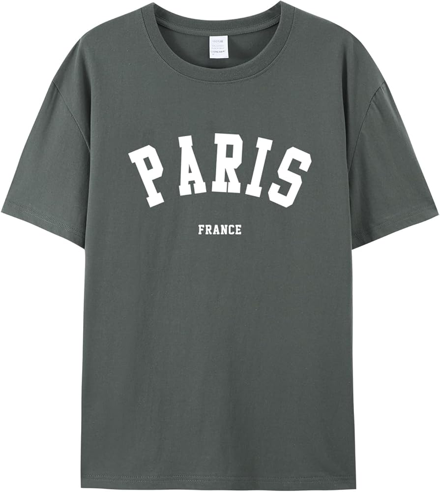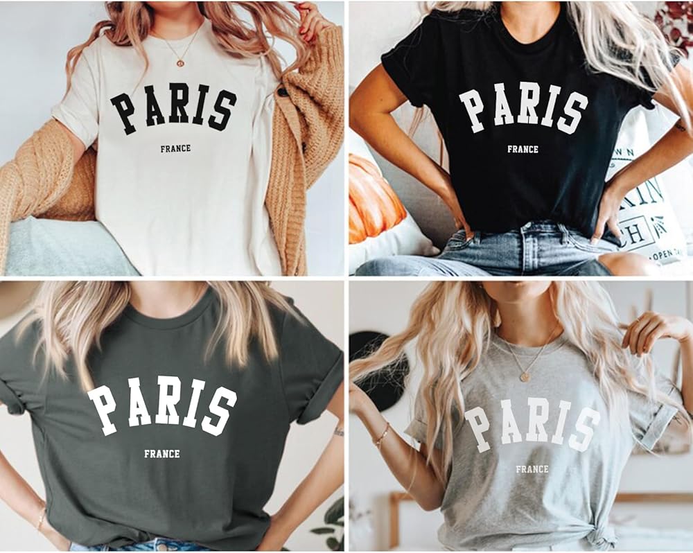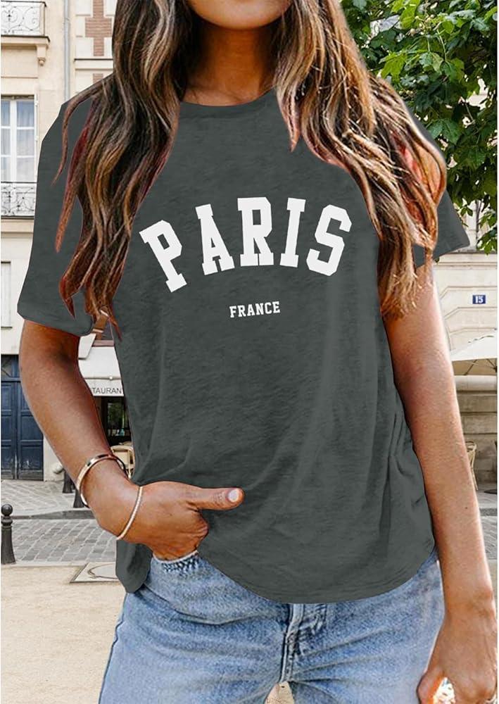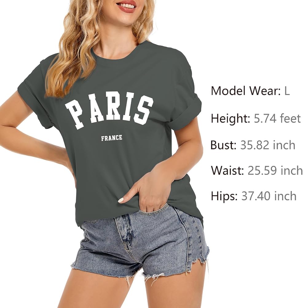 التصميمات: تصميم بنمط حروف باريس، فرنسا، تي شيرت باريس فرنسا للنساء، تي شيرت باريس للعطلات، رقبة دائرية، خفيف الوزن، مقاس كلاسيكي، أكمام بإبرة مزدوجة وحاشية سفلية.