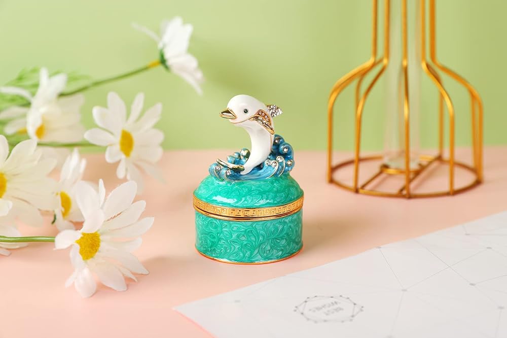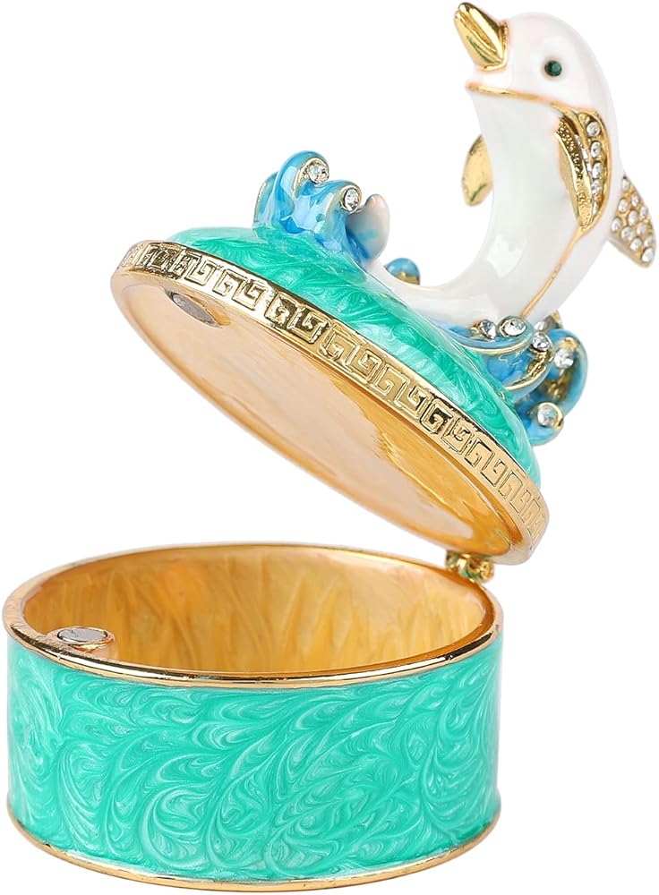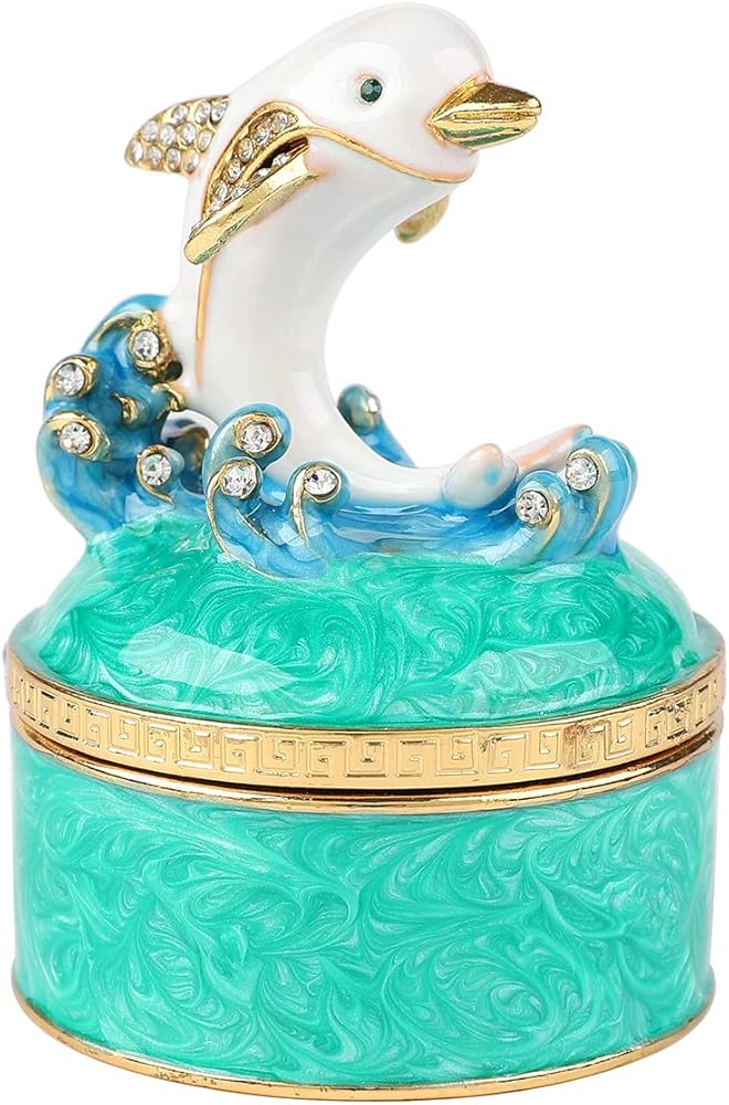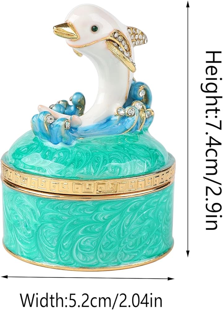- المواد: صندوق حلية دولفين لطيف مصنوع من سبائك الزنك والمينا الملونة وأحجار الراين عالية الجودة. إنه جيد للديكور والجمع.