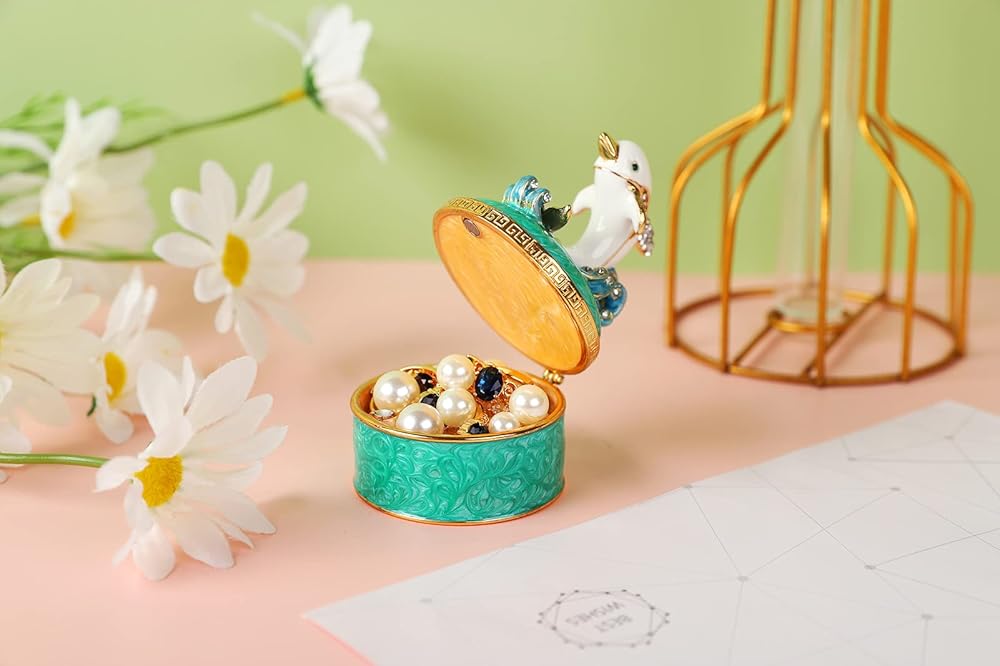 - يفتح مفصل صناديق الحلي ليكشف عن حجرة تخزين لوضع الخواتم والأقراط والمجوهرات الصغيرة. يرجى ملاحظة أن المساحة الداخلية صغيرة.