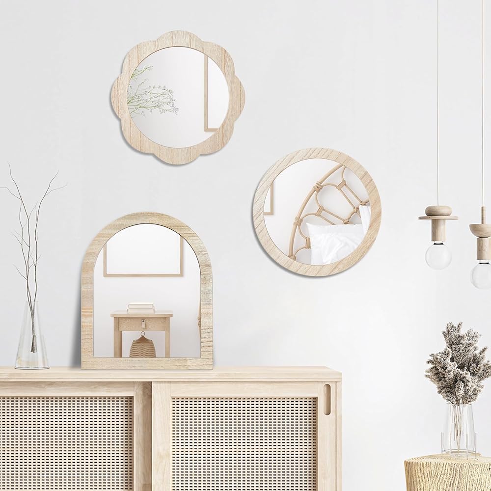 • Wall mirror decorative: there are 5 different shapes of hanging wooden mirror for your choose, you can combine any of them together as you like. They will be a beautiful scenery;