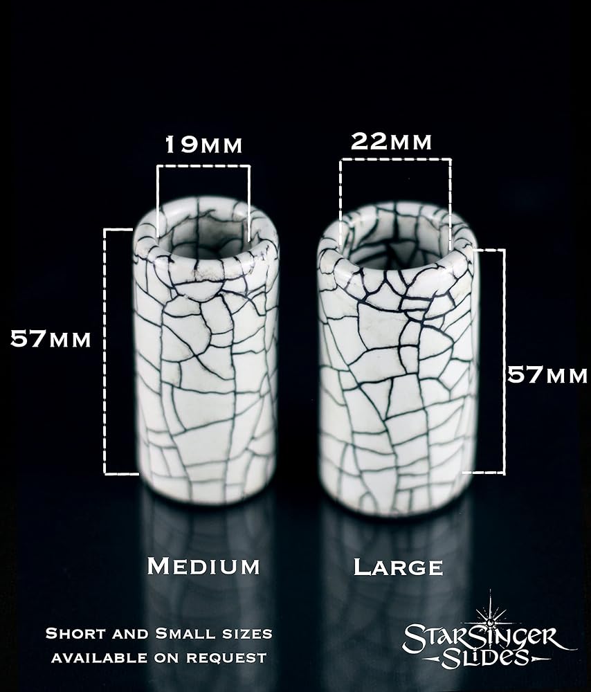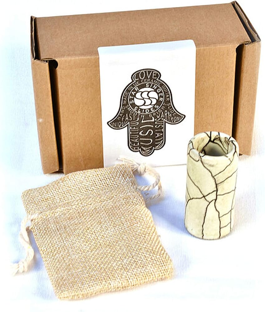 زحليقة سيراميك "ديزرت" من ستار سينجر للجيتار، مقاس متوسط. مصنوعة يدويًا في غلاستونبري، المملكة المتحدة. تتميز كل شريحة بنموذج لي جليز العضوي الفريد الخاص بها. مصمم بنسبة مثالية من الوزن إلى السمك، للحصول على صدى جيد مع الحفاظ على خفة الحركة. توفر اللمسة النهائية المطلية بالورنيش شديد اللمعان انزلاقًا سلسًا وصامتًا على الأوتار. في نهاية عملية الإنتاج، يتم خبزها على درجة حرارة تزيد عن 1200 درجة مئوية. الشرائح مصنوعة يدويًا من الحجر، للحصول على منتج قوي ومتين للغاية. يسقط اللون الدافئ والمشرق بشكل ممتع في مكان ما بين الشرائح الزجاجية والمعدنية. مصممة لتبدو رائعة على الغيتار الصوتي والكهربائي وصندوق السيجار. تتضمن حقيبة لطيفة للتخزين الآمن. صُنعت زلاجات ستار سينجر بواسطة دولفين روبي ستار سينجر (اسم الصانع - ربما قصة لوقت آخر) في سقيفة صغيرة خارج غلاستونبري، وتحولت إلى ورشة إنتاج شرائح صغيرة وحميمة. على مدى السنوات السبع الماضية، أتقن دولفين عملية إنشاء الشرائح الخاصة به وحسّنتها، وتعلم من والده تقنية لو جليز المعقدة. عملية فائقة الدقة وتستغرق وقتًا طويلاً. ومع ذلك، يجدر رؤية كل قطعة تخرج بنموذجها العضوي الخاص بها. المواصفات: المقاس: متوسط. الارتفاع: 57,0 ملم. القطر الداخلي: 19,0 ملم. الجدار: 4.5 ملم. حجم الخاتم: 9 (UK) / 19.5 (US). المزايا: المادة: سيراميك. اللمسة النهائية: مطلي بالورنيش اللامع. اللون: رملي، كل شريحة لها نموذج لي جليز العضوي الفريد الخاص بها. الملحقات: حقيبة للتخزين الآمن. شبشب ستار سينجر، قطع فريدة مصنوعة يدويًا في المملكة المتحدة.