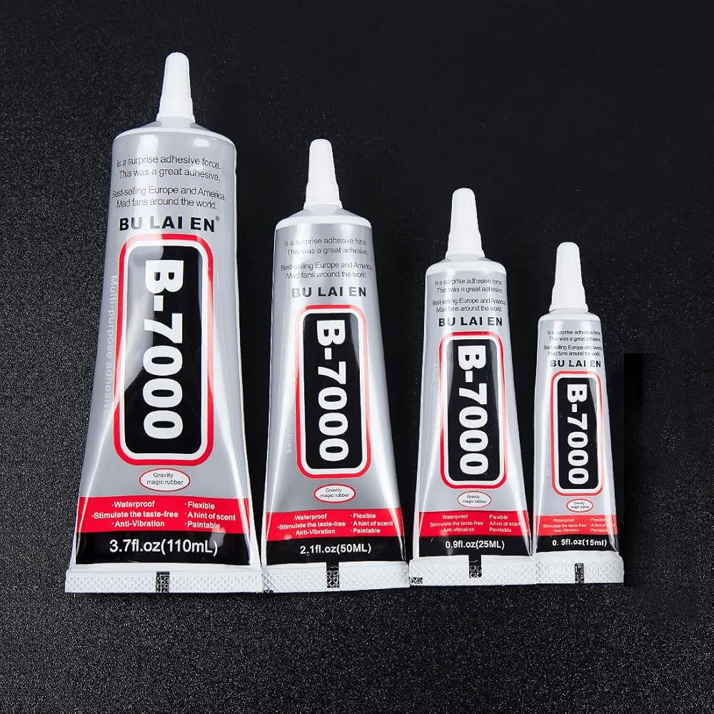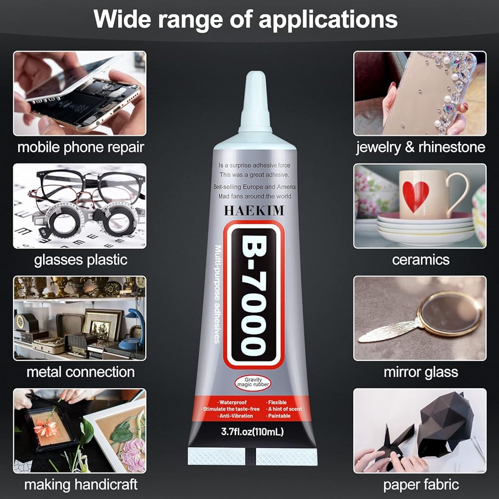 B7000 Glue adhesive Multi Purpose : suitable for SmartPhone, Tablet, Electronic Components, Jewelry, Toys, Metal, Glass, Rubber, Fiber, Paper, Ceramics, Wood, Cloth, Textile, Nylon, PVC, Leather and other materials. it also can be glass glue.