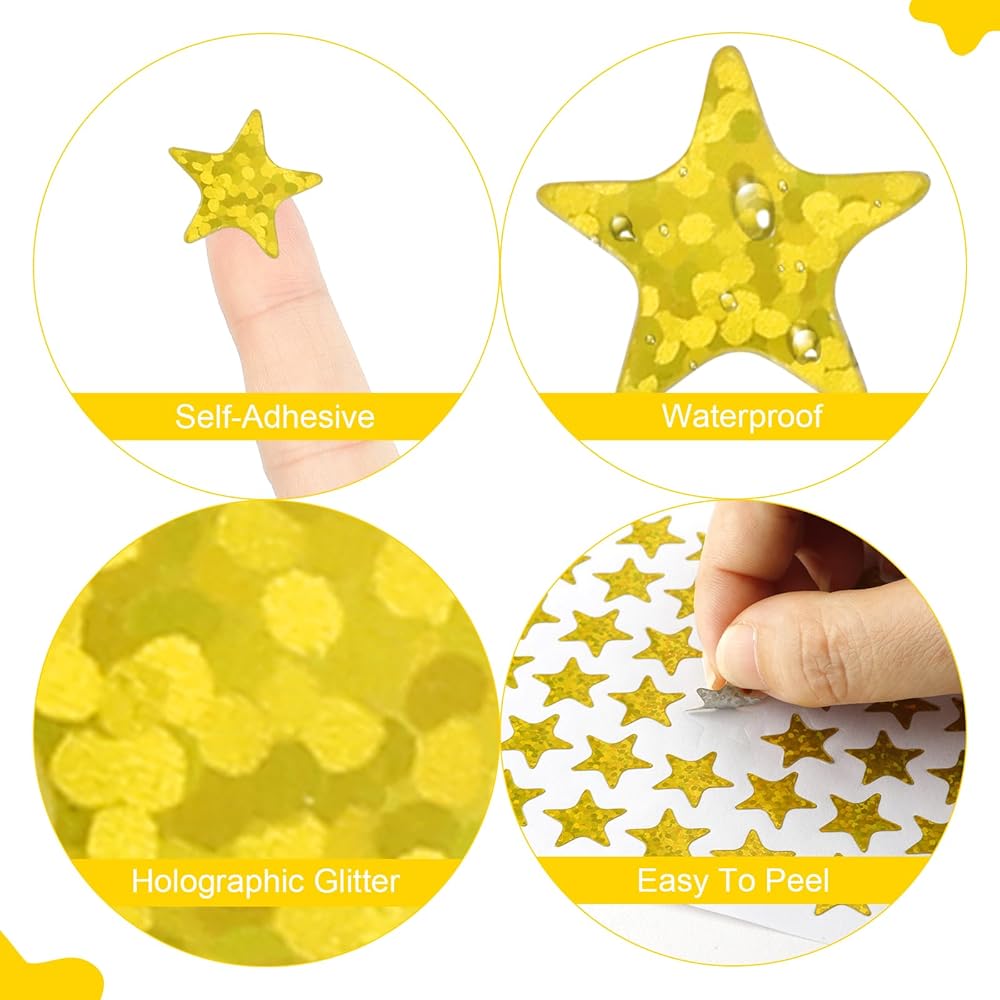⭐Premium Material: The material we use to create these star labels is a Holographic paper with shiny surfaces, the surface is bright, non-toxic and tasteless. odorless, The back of the sticker is made of high-quality self-adhesive material, They stick to all kinds of different surfaces.