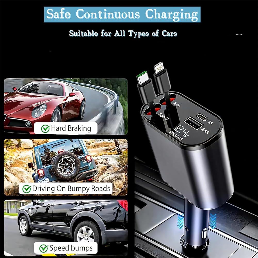 [Suitable for Various Vehicle Models] The car cell phone charger boasts extensive compatibility, designed to fit numerous vehicle models. The retractable charger is suitable for the common 12V-24V car outlets, ensuring a stable plug-in connection. It features smart shunt technology for safely charging your mobile device, and is firmly designed to stay plugged in, even on rough roads.