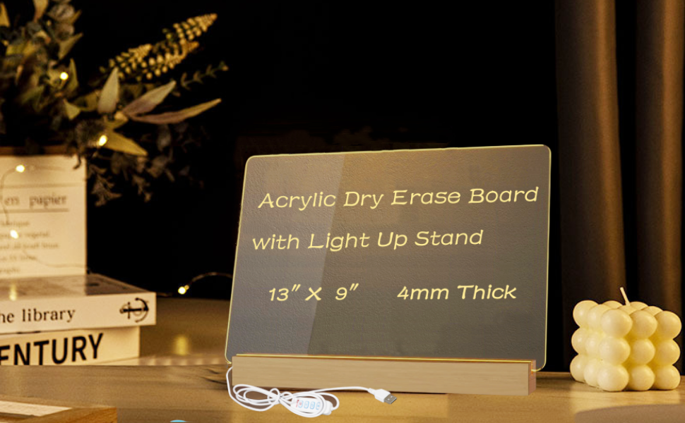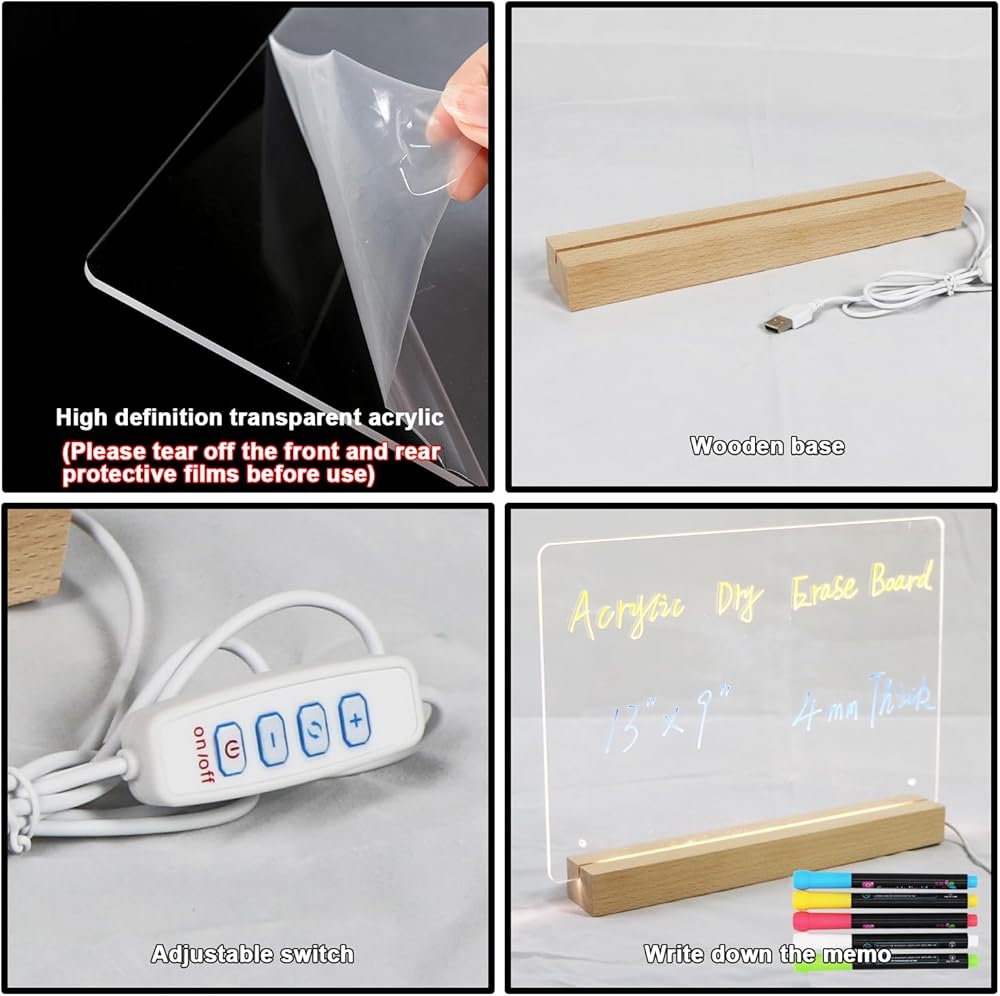 لوحة مسح جافة من الأكريليك مع حامل مضيء مقاس 13 × 9 بوصة لوحة رسائل LED قابلة للتعديل مع 3 أوضاع إضاءة لوحة ملاحظات سطح المكتب واضحة مع 5 علامات مسح جافة للمكتب والمدرسة والمنزل