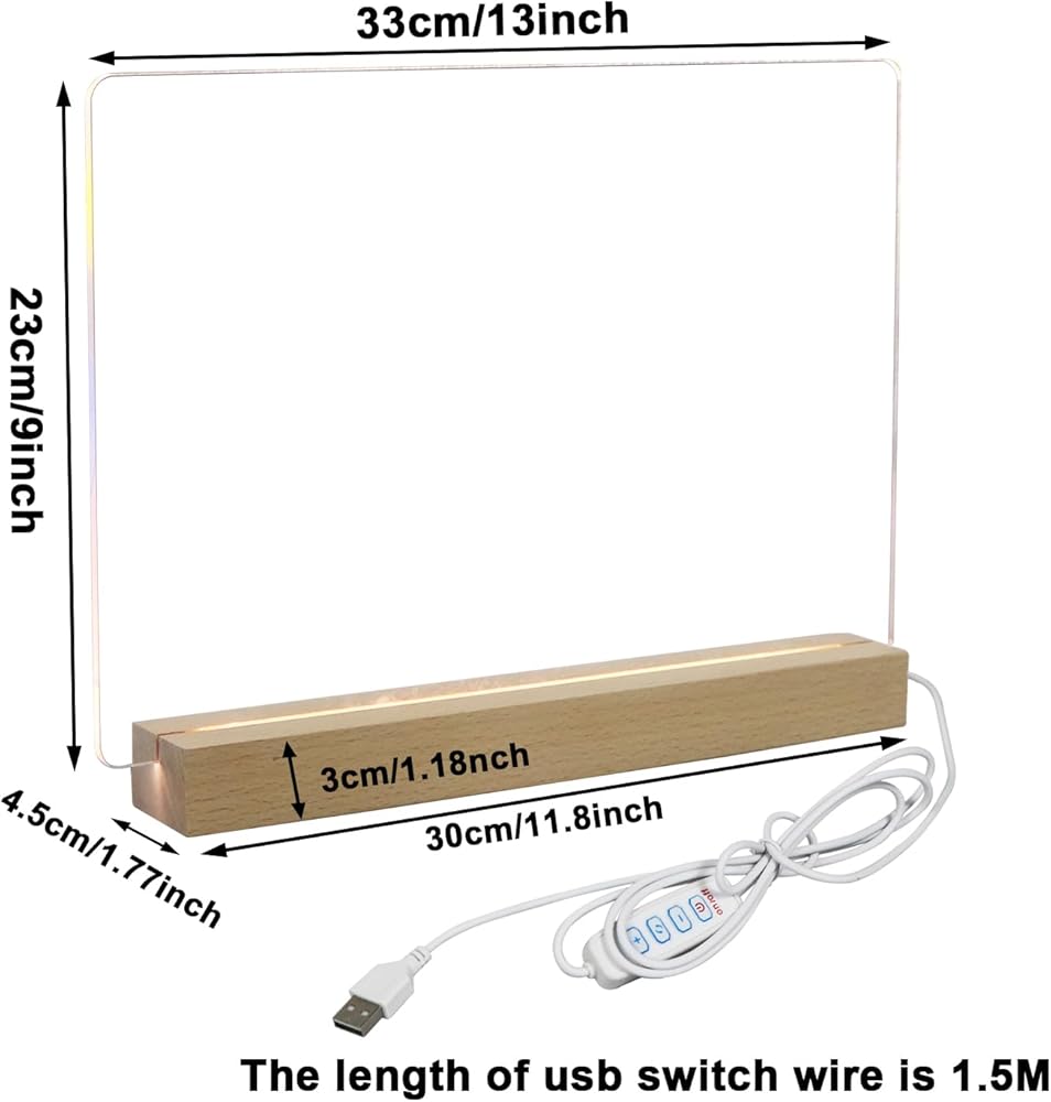 سهل التشغيل: سهل الإعداد باستخدام زر ضغط سهل للتشغيل والإيقاف. ما عليك سوى إزالة الغشاء الواقي من لوح الأكريليك، وتوصيل القاعدة بمصدر طاقة USB، وكتابة رسالتك على اللوحة، وتشغيل الضوء.