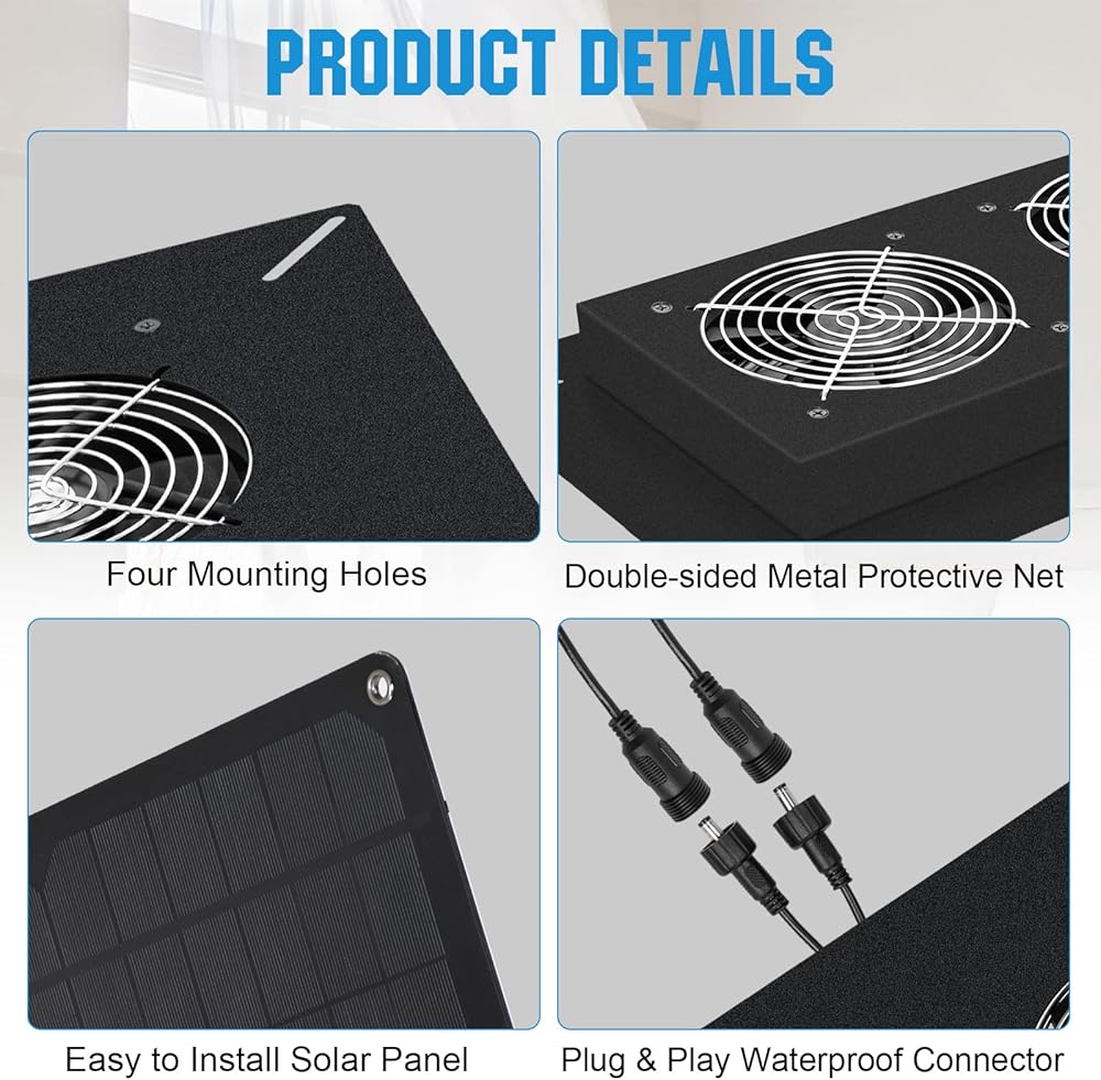 [تركيب سهل] - يمكن توصيل اللوحة الشمسية والمروحة وتشغيلها من خلال موصل مقاوم للماء، كما أن اللوحة الشمسية لديها فتحات تثبيت محفوظة لك لتثبيتها على أي جدار أو سقف.