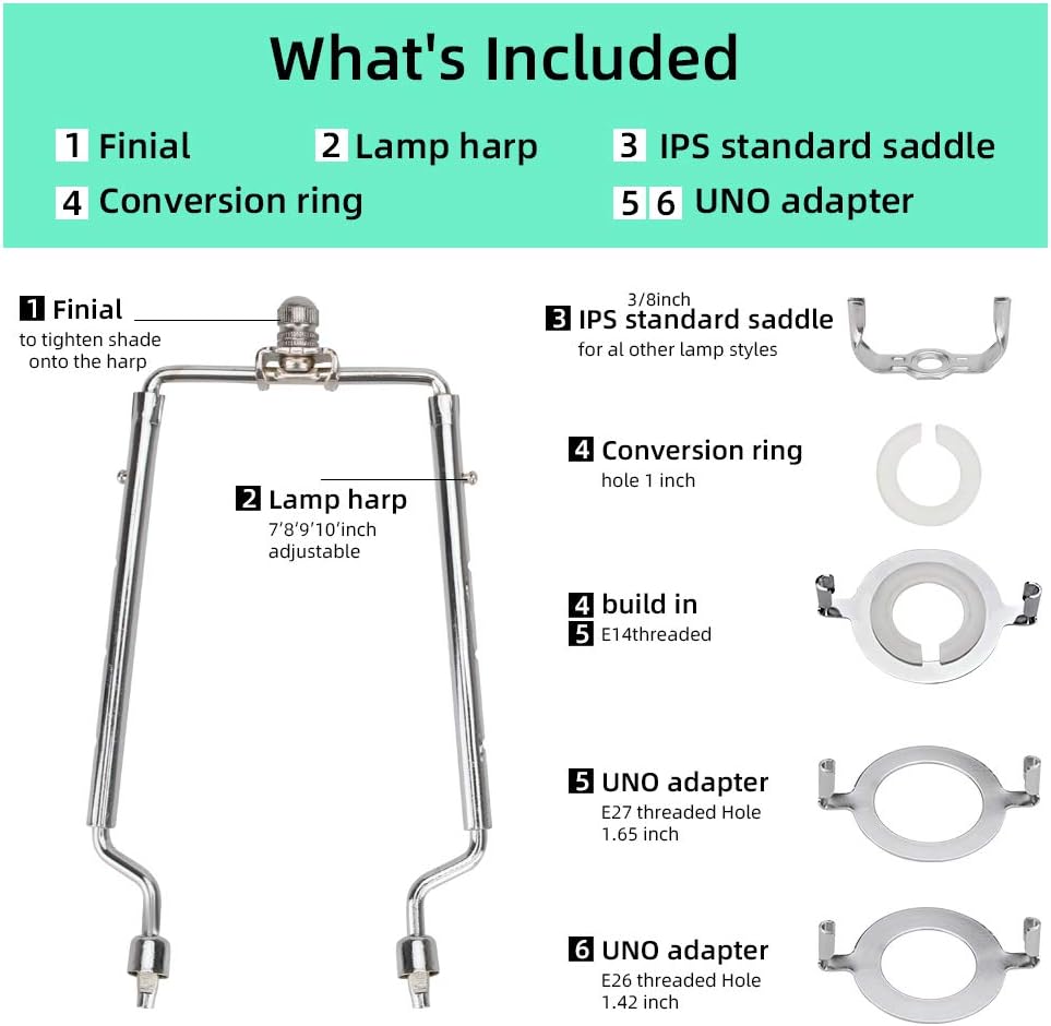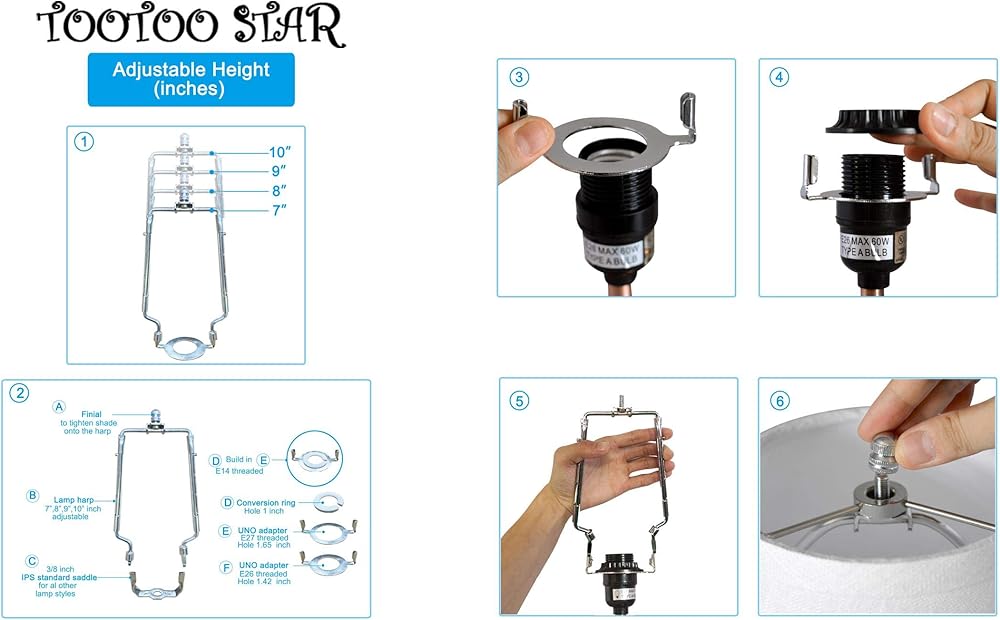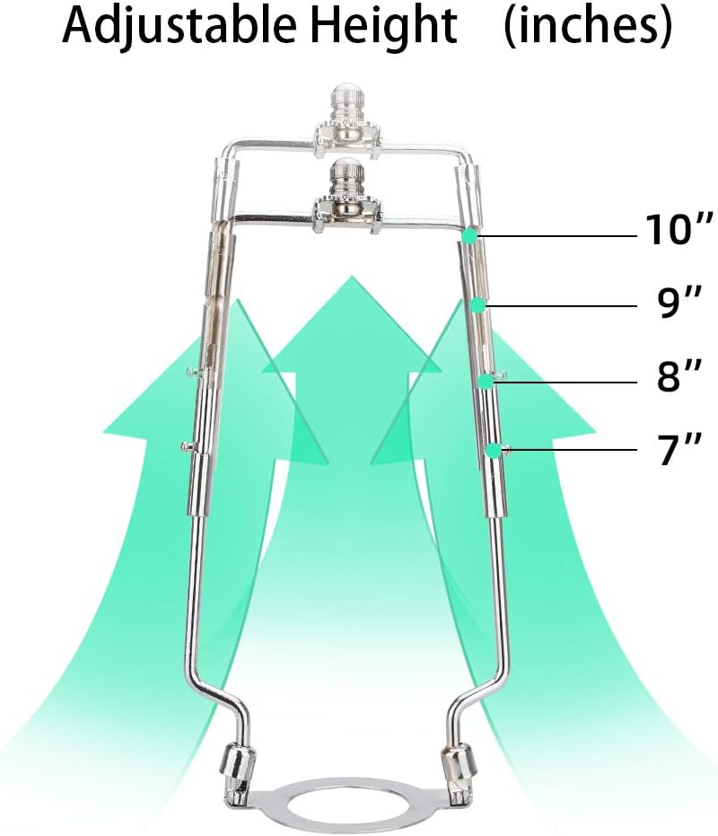 7 8 9 10 بوصة TooToo Star Lamp Shade Harp حامل 3/8 Standard&E14&E26&E27 Light Base UNO Fitter محول محول مجموعة نهائية، قابل للتعديل طويل القامة 7 8 9 10 بوصة، أجزاء قابلة للفصل دعم قوس فضي