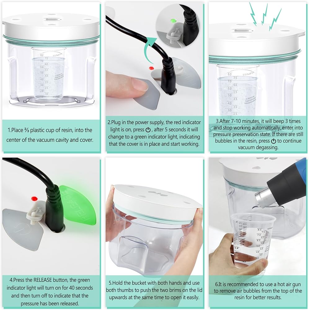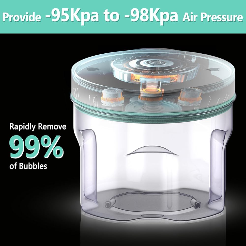 • إزالة 99% من الفقاعات بسرعة: يوفر مزيل فقاعات الراتنج الخاص بنا ضغط هواء -95 كيلو باسكال إلى -98 كيلو باسكال، والذي يمكن أن يزيل المزيد من فقاعات الهواء في 5-7 دقائق. إنه أكثر ملاءمة لصنع المجوهرات والحرف اليدوية من راتنجات الإيبوكسي. يرجى ملاحظة أنه بمجرد التخلص من فقاعات الهواء الموجودة في الراتينج بشكل يرضيك، قم بإيقاف تشغيله على الفور واضغط على "RELEASE" لإزالة الراتينج، وإلا فقد يتم علاج الراتينج.
