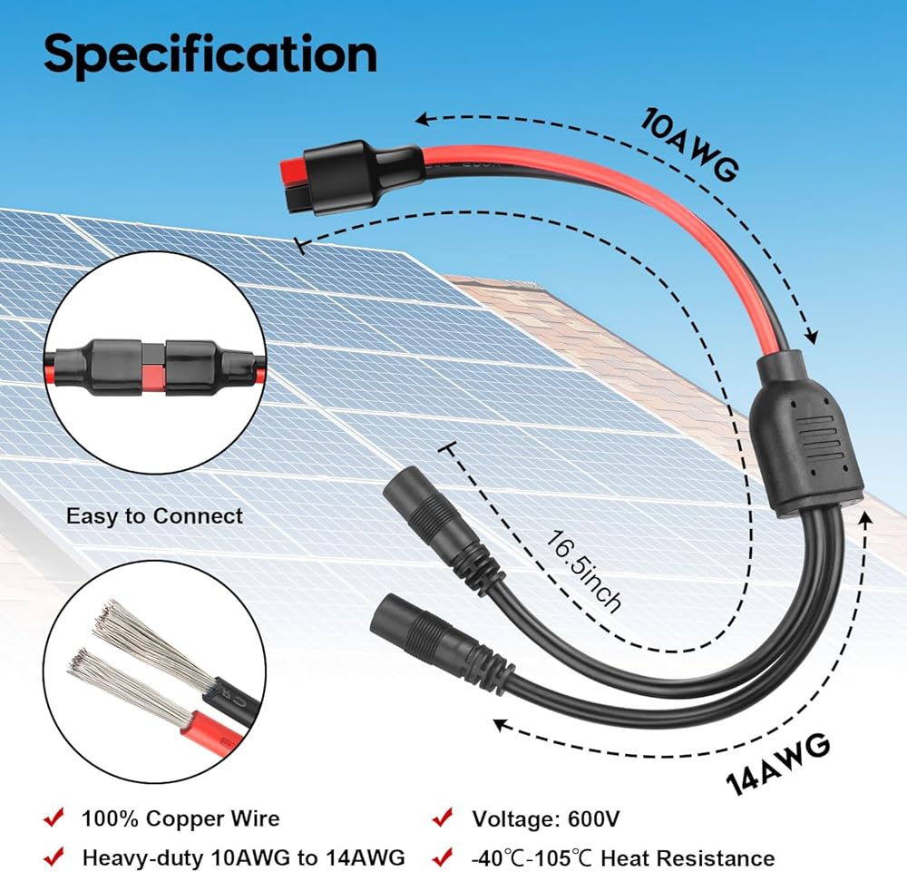 محول شمسي عالي الجودة: طرف موصل أندرسون هو سلك نحاسي عالي التحمل 10AWG، متوافق مع كابل الطاقة الشمسية 12AWG و14AWG/16AWG؛ الطرف الأنثوي DC 8 مم هو سلك نحاسي 14AWG. سترة مزدوجة من PVC، مرنة ومقاومة للاهتراء، أفضل تأثير عزل. مقاومة للحرارة 80 درجة مئوية. الجهد الكهربي المقدر: 600 فولت، التيار المقنن: 20 أمبير. طول الكابل: حوالي 42 سم/16.5 بوصة.