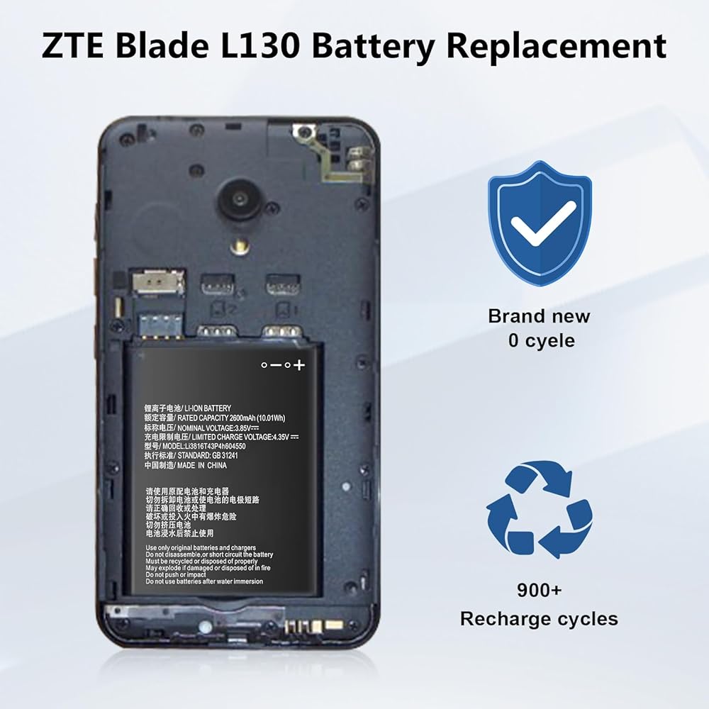 بطارية بديلة Li3816t43p4h604550، 【2600 مللي أمبير في الساعة】(𝟮𝟬𝟮𝟰 𝗡𝗲𝘄 𝗨𝗽𝗴𝗿𝗮𝗱𝗲𝗱) متوافقة مع ZTE Blade L130 Z2335CA Grand MAX 4550 3.8V/5.3 ذوي الخوذات البيضاء