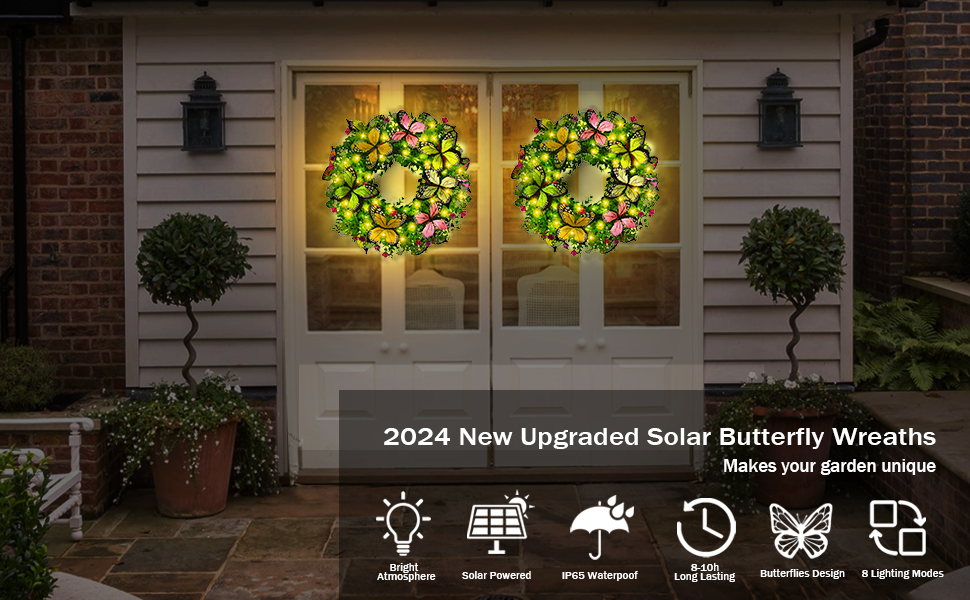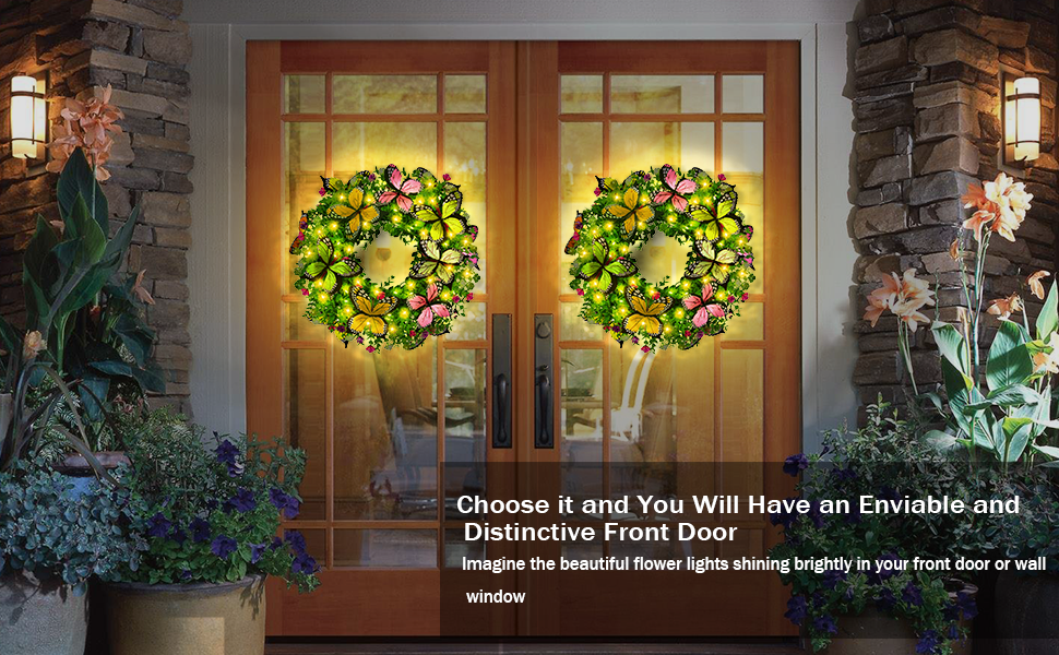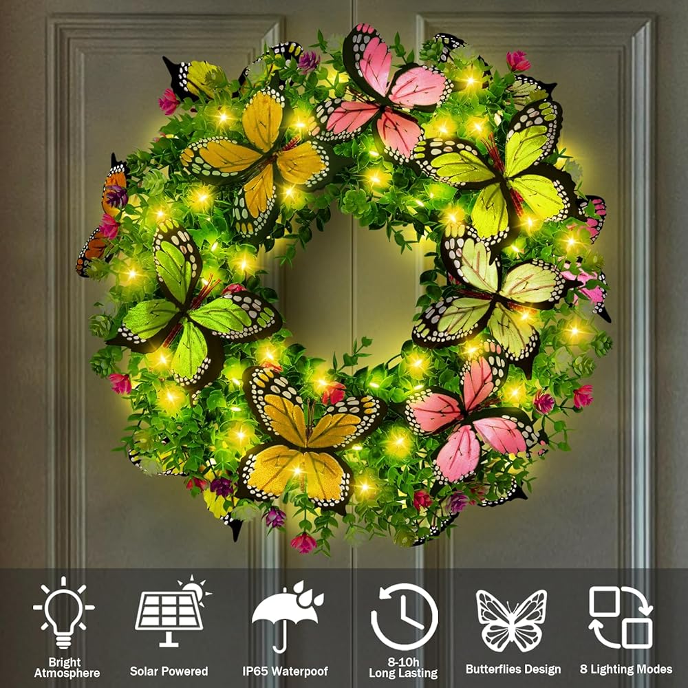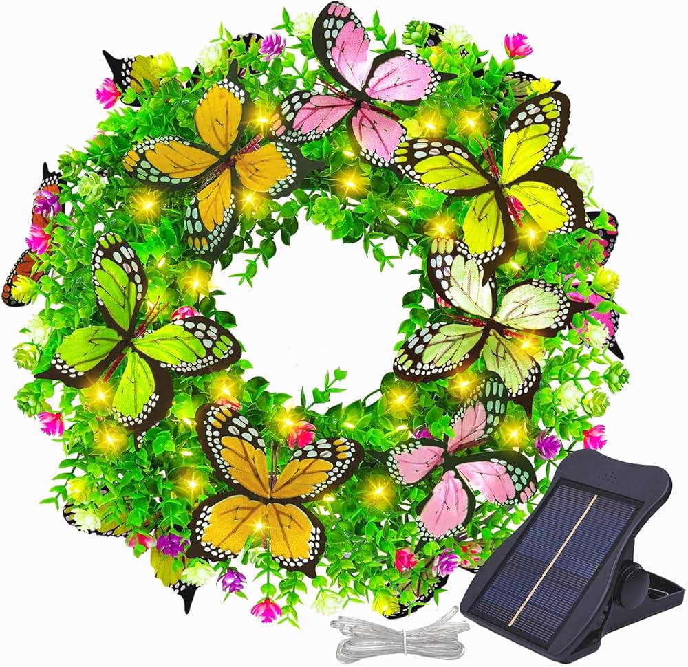 اكاليل الصيف للباب الأمامي مع أضواء الشمسية، 18in اكاليل الزهور الربيع أضواء مع الزهور الاصطناعية والفراشات، مثالية لنافذة الحائط المنزل في الهواء الطلق الزفاف الذكرى السنوية ديكور مهرجان الصيف