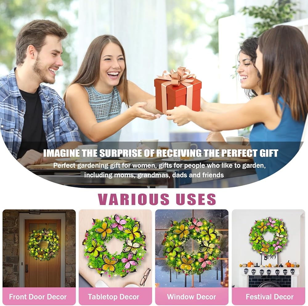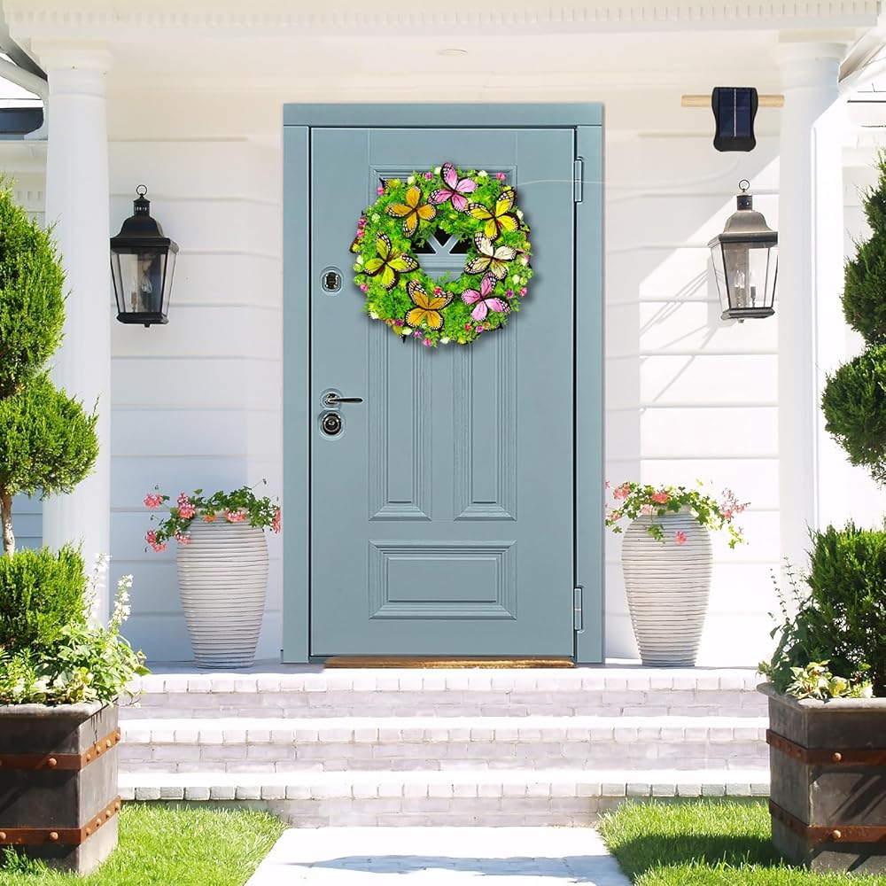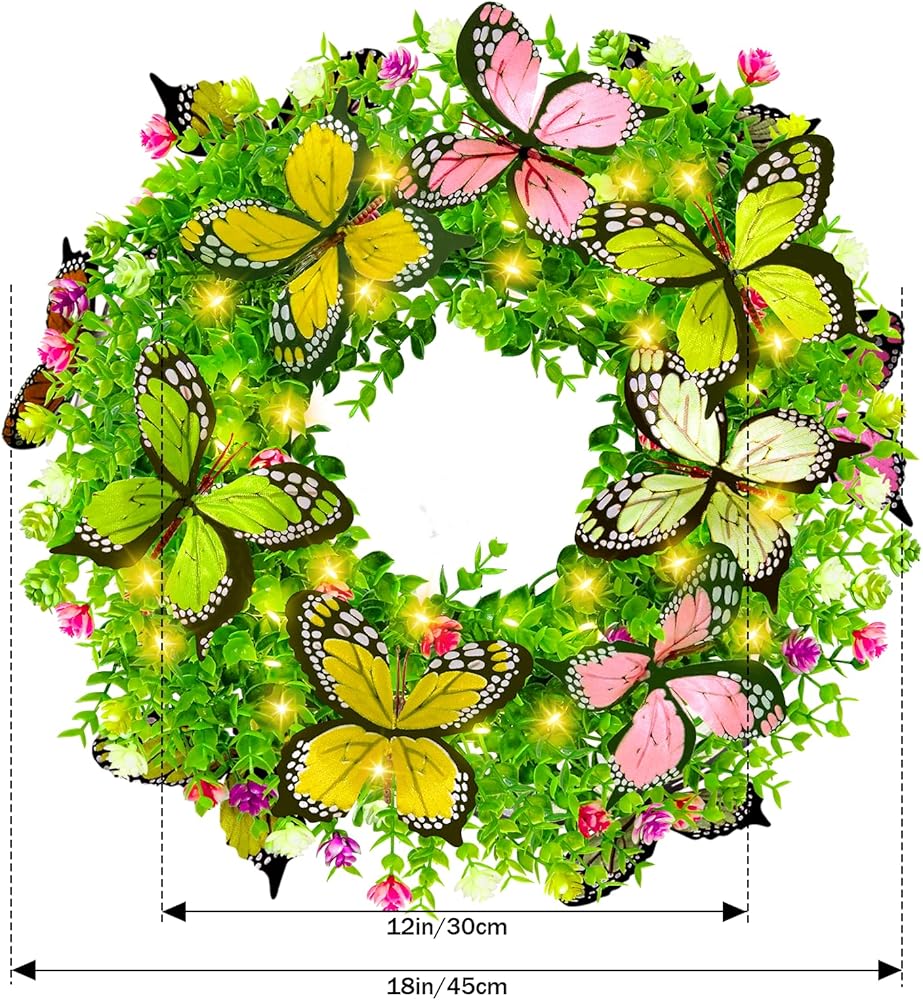 تصميم رقيق ووافر-- يتميز إكليل الربيع مقاس 18 بوصة بزهور حريرية ملونة وأوراق خضراء محاطة باثنتي عشرة فراشة كبيرة. تم ترتيب هذه العناصر بمهارة على قاعدة من الروطان لخلق نكهة طبيعية لمنزلك. فهو يجعل منزلك مختلفًا عن جيرانك '.تخيل إكليلًا جميلًا على بابك الأمامي، مما يضفي الحيوية على المكان.