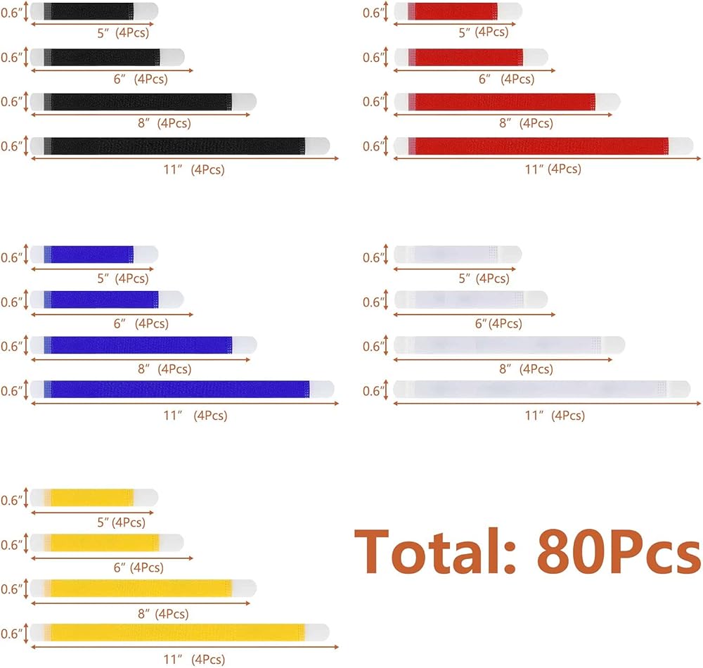 80pcs black cable ties in package,assorted 4 size:11" x 0.6" (20pcs),8" x 0.6" (20pcs), 6" x 0.6" (20pcs) and 5" x 0.6" (20pcs).