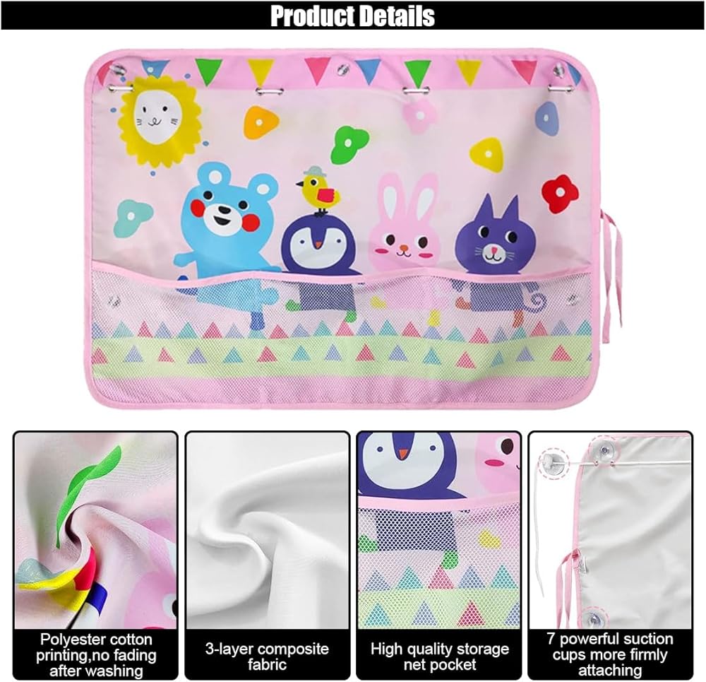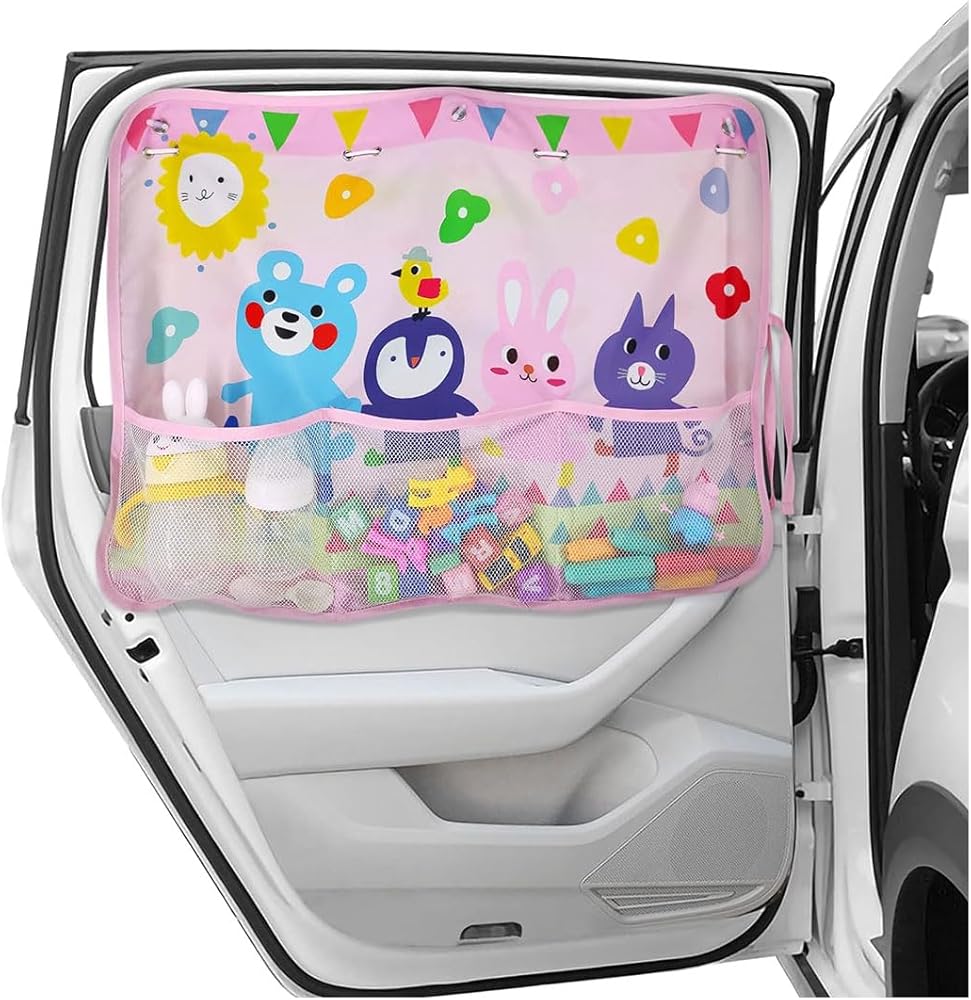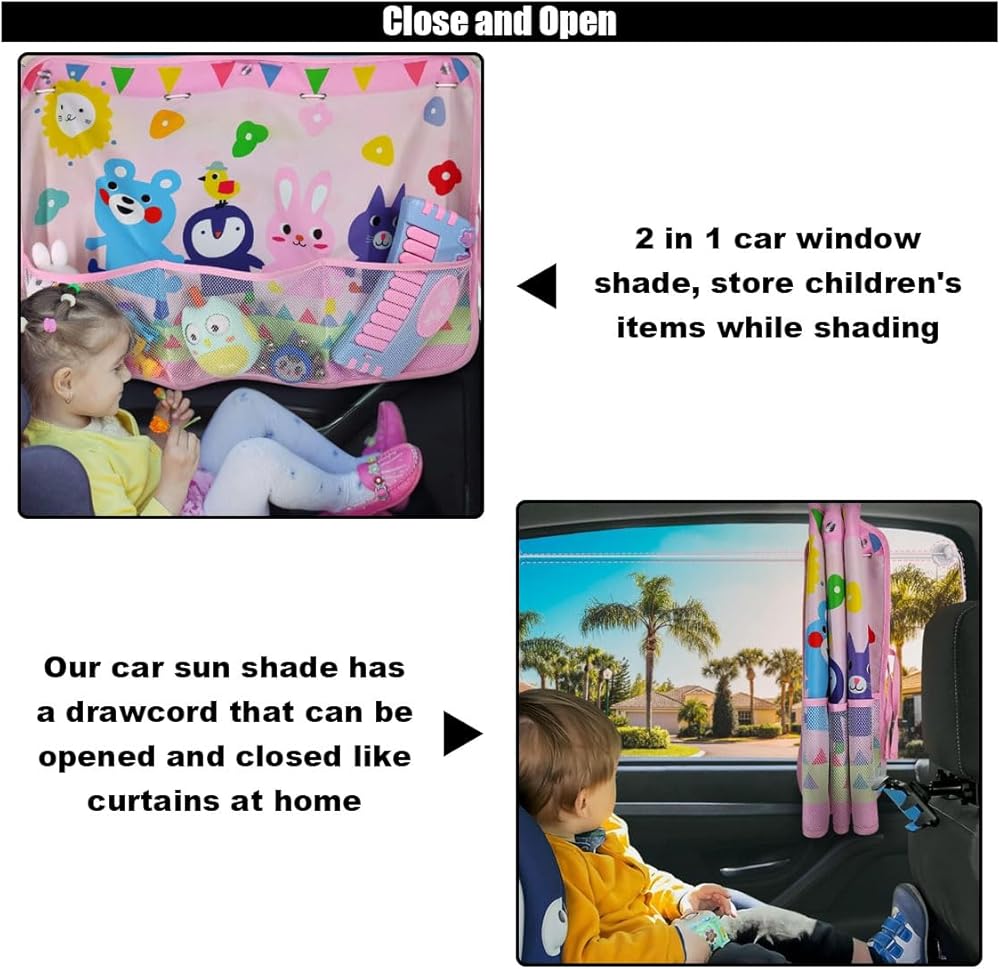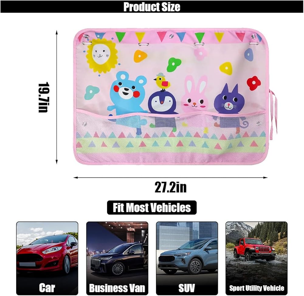 • 【Net Storage Pockets Designed for Children】:The sunshade is designed with cute cartoon patterns, which can attract children's attention and make their journey more enjoyable. In addition, it comes with mesh bags that can store snacks, bottles, small toys, water bottles, towels, and other small items.