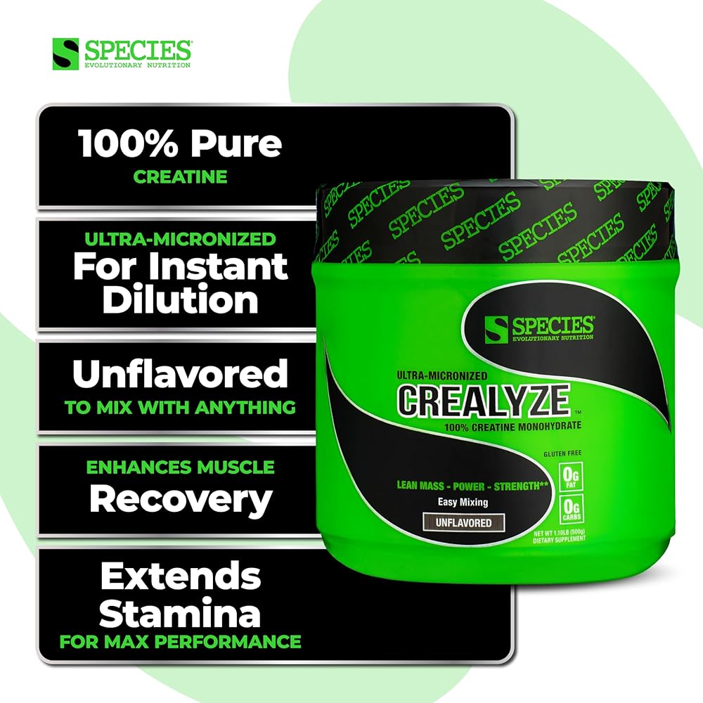 100% كرياتين مونوهيدرات: تركيبة كريلايز من شركة Species Nutrition هي 100% كرياتين مونوهيدرات نقي. تبلغ كل حصة 5 جرام، مما يمكن أن يساعد في تعزيز الأداء والقدرة على التحمل. تحتوي التركيبة على 0 جرام من الكربوهيدرات و0 جرام من الدهون لكل وجبة.